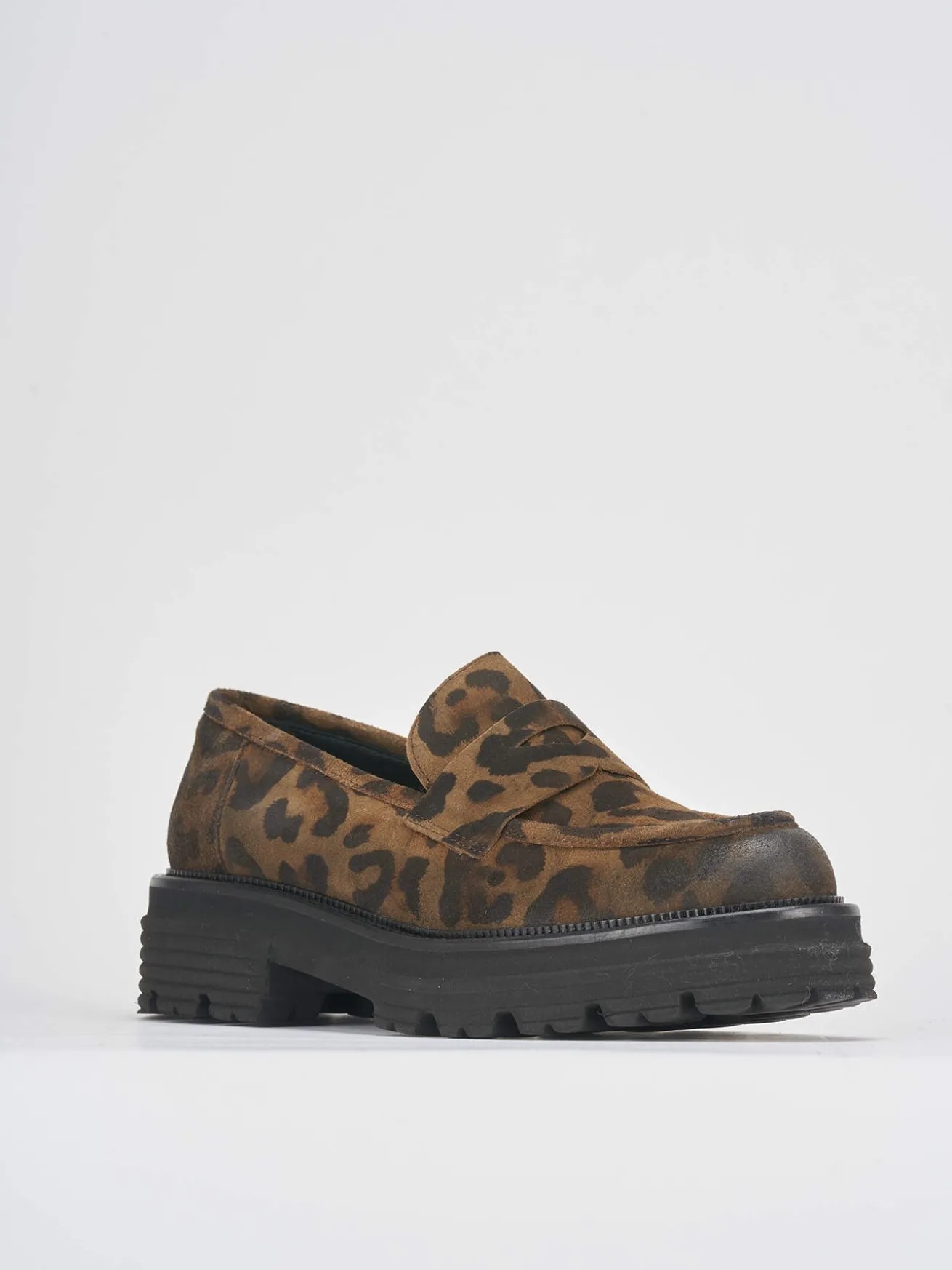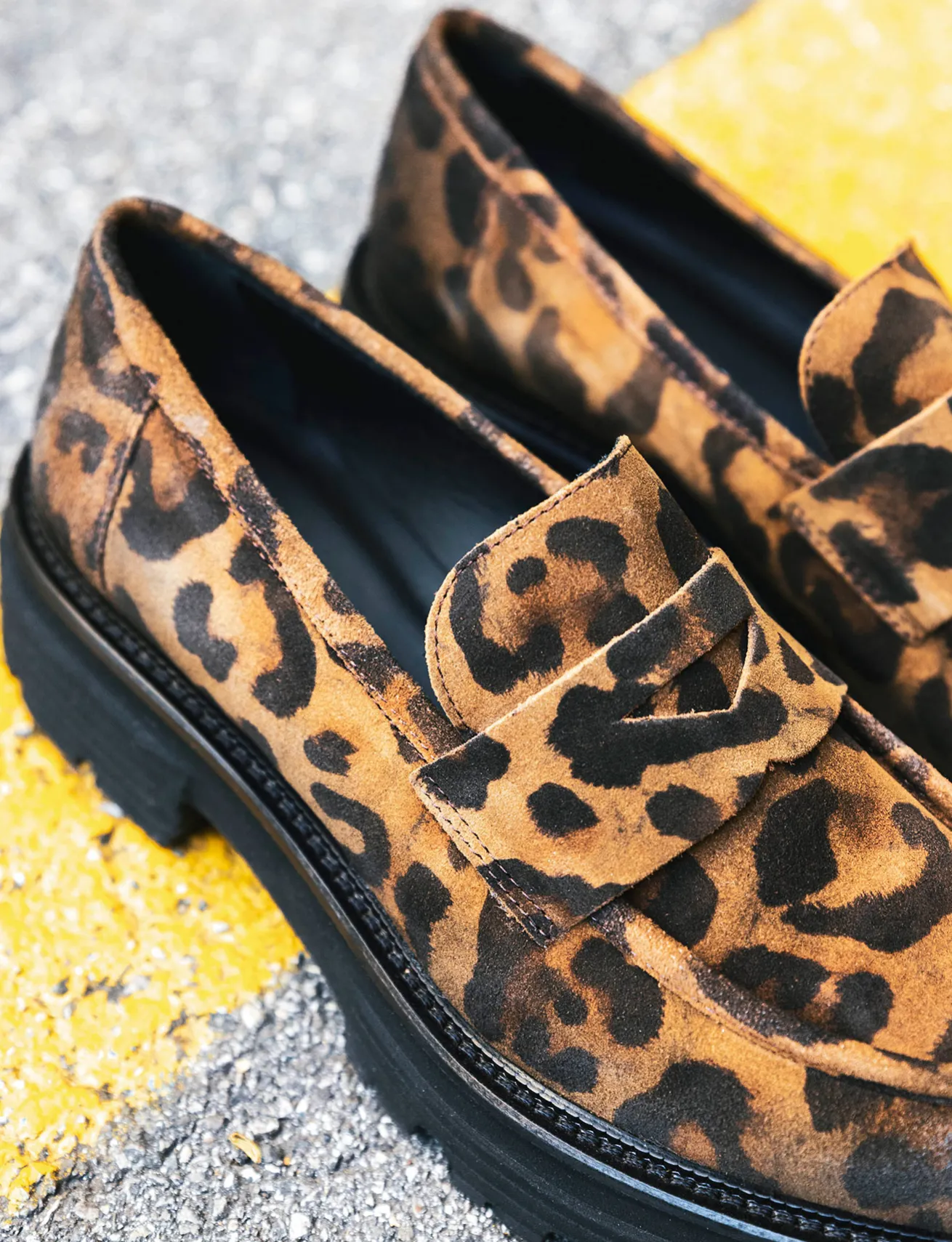 Mocassino tacco 2 cm fondo in gomma e soletto interno in vera pelle. Tomaia in morbido camoscio con stampa leopardata, punta tonda, mascherina a bocca di leone e cuciture a vista per un tocco fun ai tuoi look.