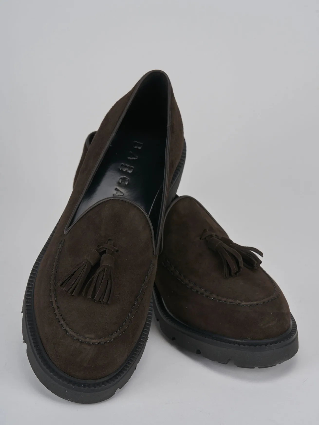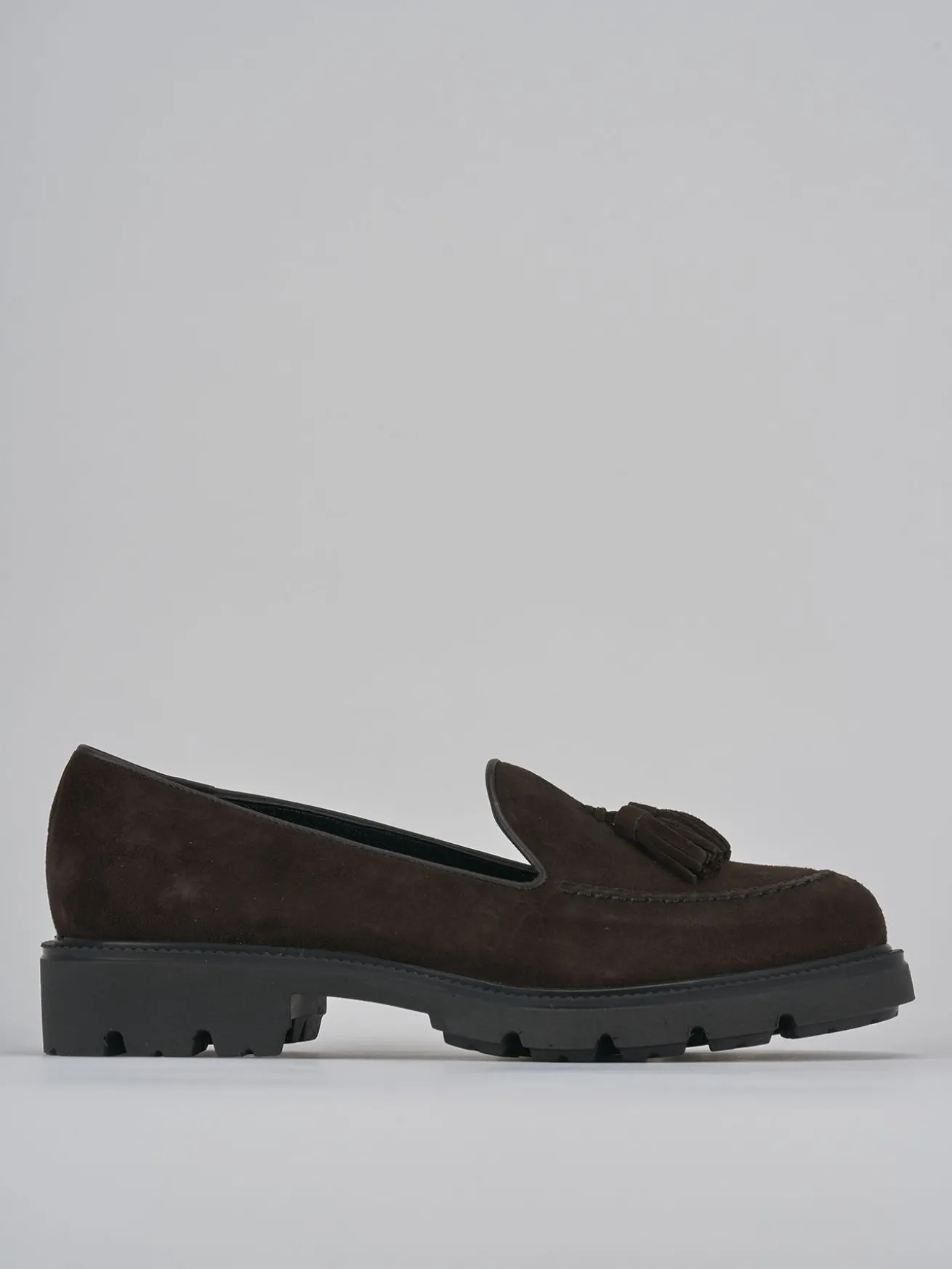 Mocassino tacco 2 cm fondo in gomma e soletto interno in vera pelle. Tomaia in morbido camoscio, punta affusolata, cuciture visibili, nappine e fondo light per un look chic. adatto con dei jeans o un vestito.