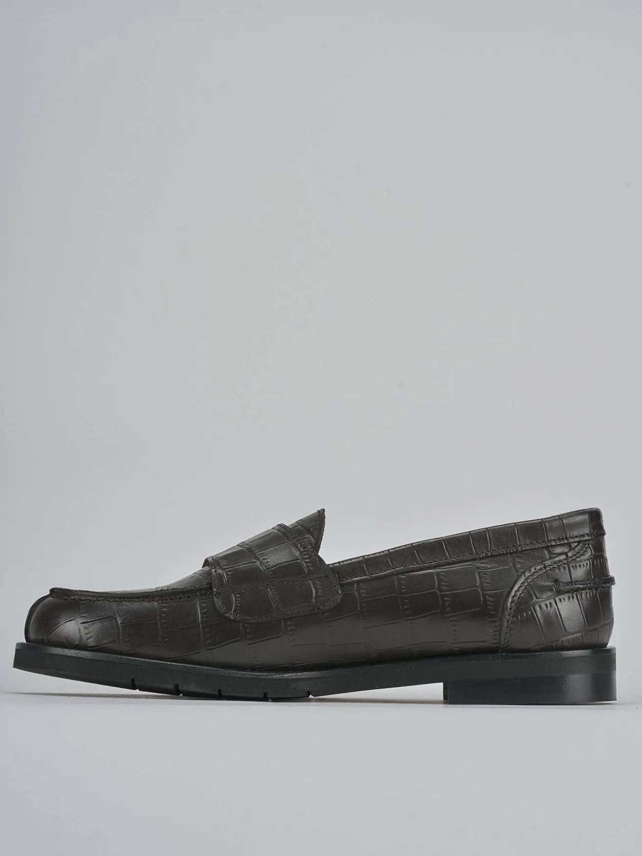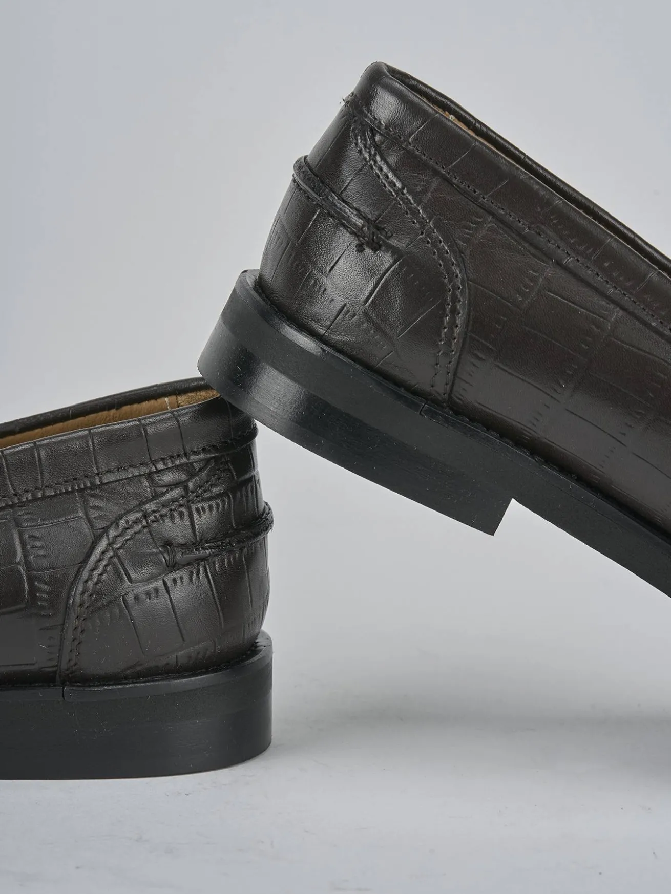 La tomaia in morbida pelle color testa di moro offre un tocco sofisticato, mentre la punta affusolata e le cuciture alla norvegese aggiungono un dettaglio artigianale di pregio.