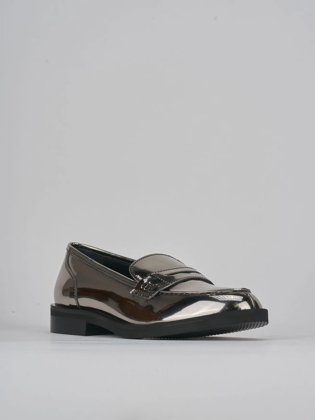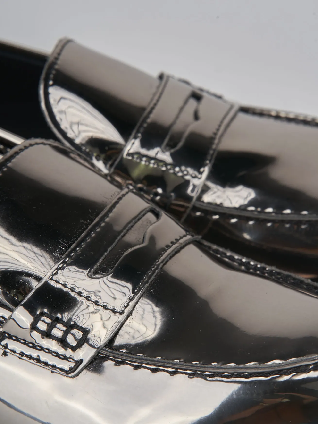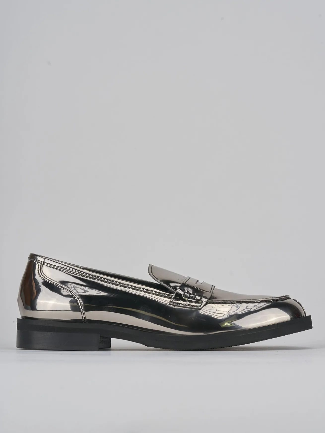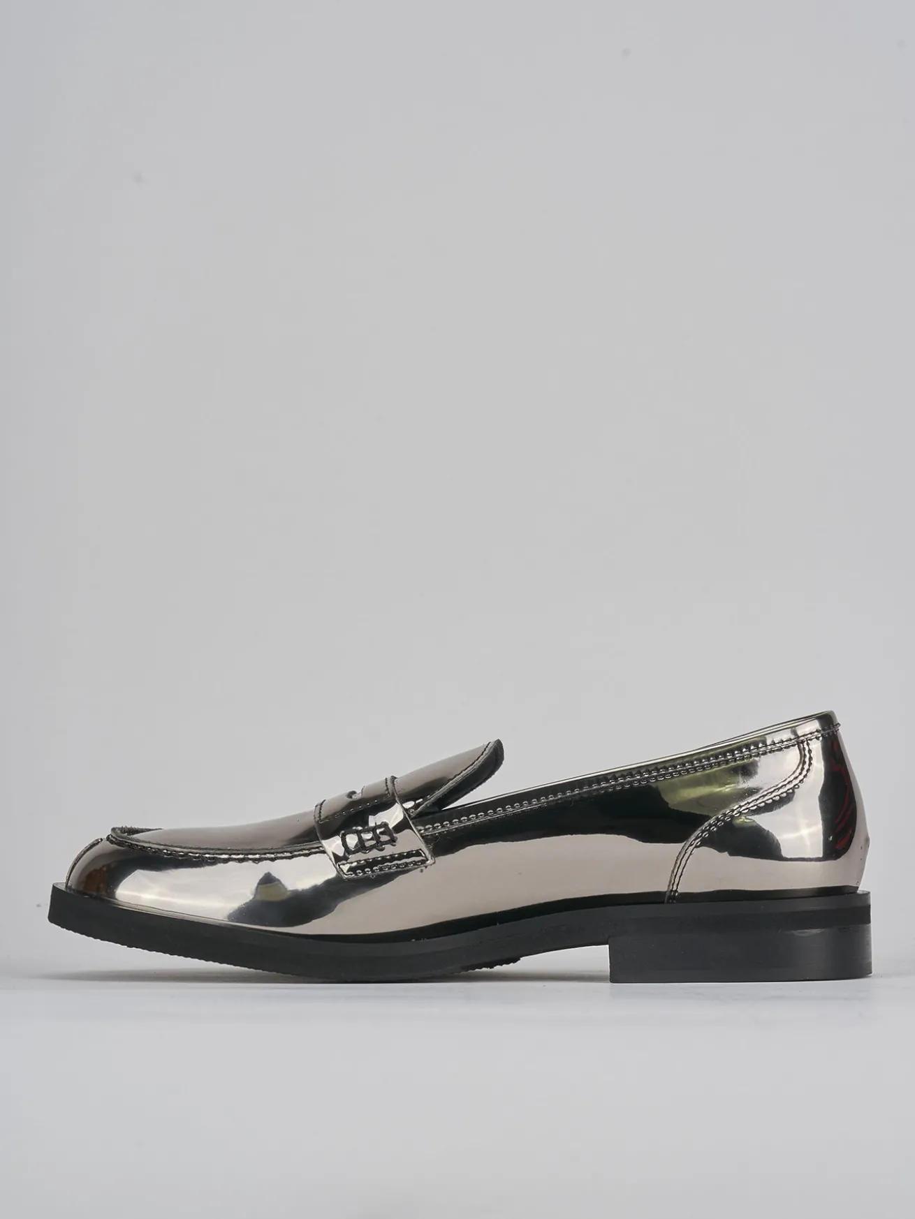 Mocassino tacco 2 cm fondo in leggera gomma e soletto interno in vera pelle. Tomaia in morbida pelle effetto specchio, punta tonda, cuciture visibili e mascherina a bocca di leone per un tocco fun ai tuoi outfit.