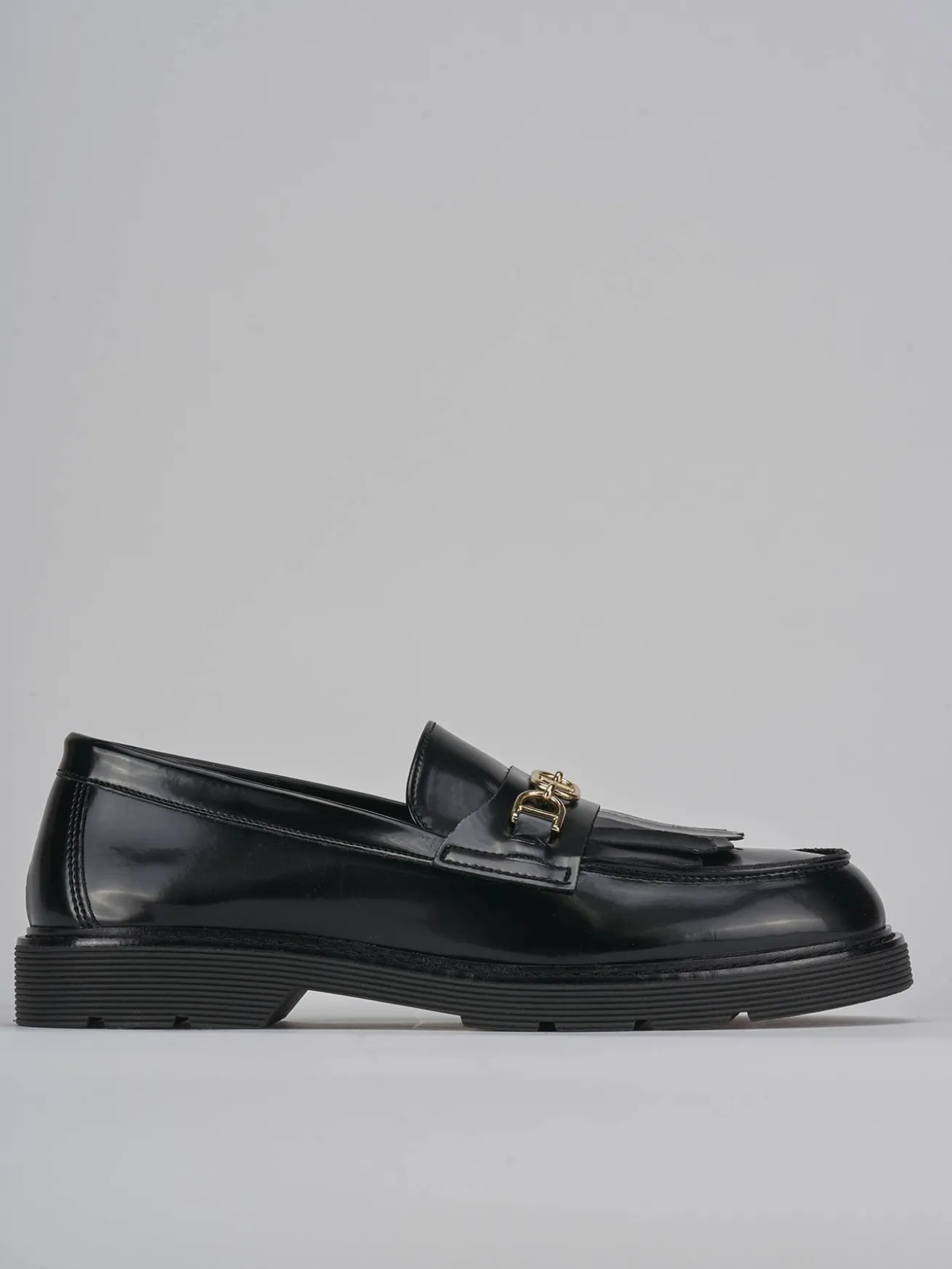 mocassino tacco 2 cm fondo in gomma e soletto interno in vera pelle. tomaia in morbida pelle abrasivata, punta leggermente squadrata, cuciture visibili, accessorio in metallo, frange per un look chic.
