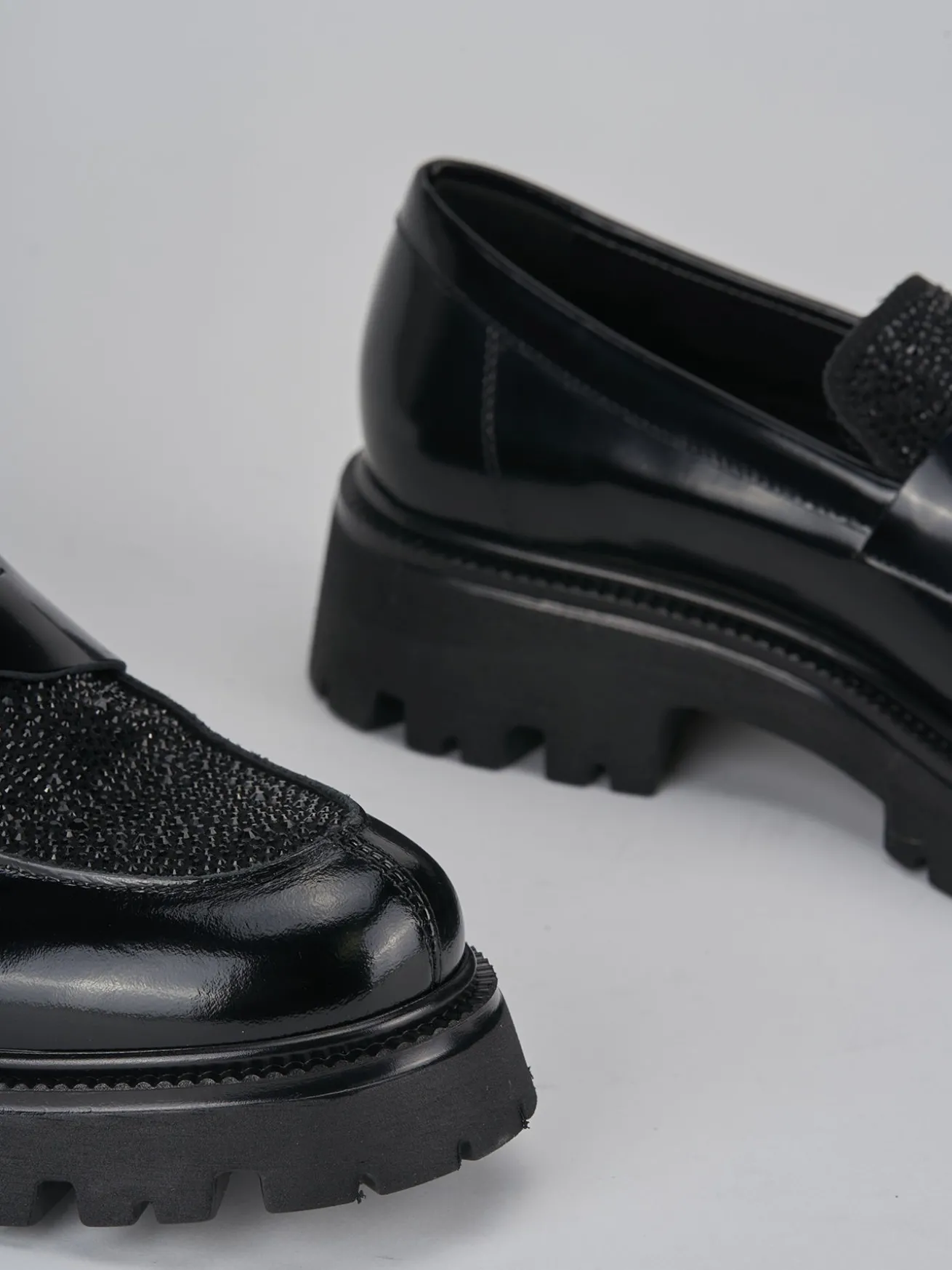 Realizzati con una raffinata tomaia in pelle abrasivata effetto lucido, questi mocassini catturano l’attenzione con la loro punta leggermente squadrata arricchita da strass scintillanti.