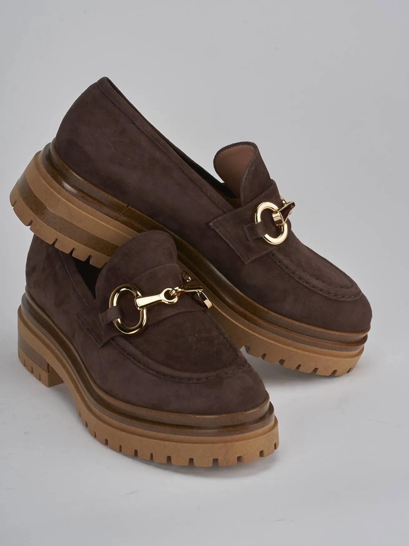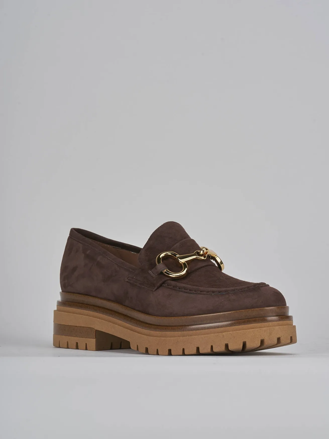 mocassino tacco 2.5 cm fondo in gomma e soletto interno in vera pelle. tomaia in morbido camoscio, punta tonda, cuciture fatte a mano a vista, morsetto e doppio fondo a contrasto per un look cool.