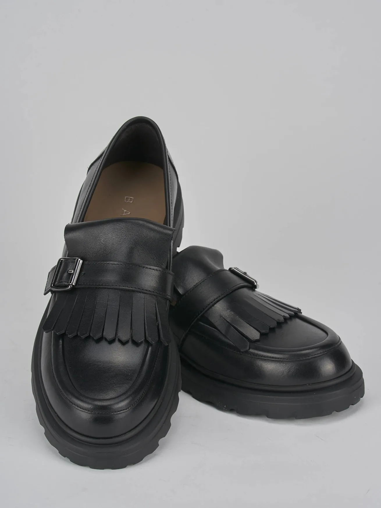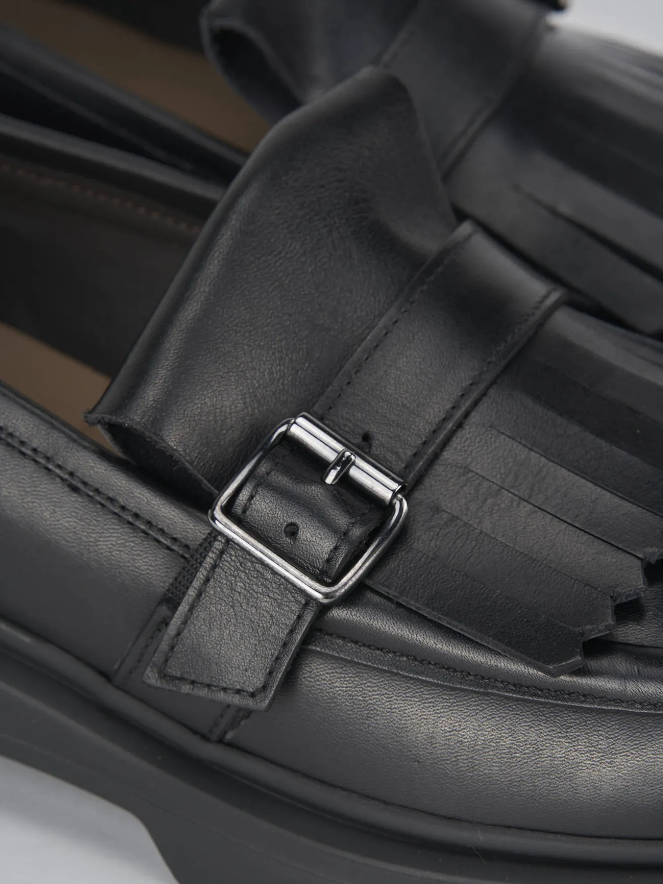 mocassino tacco 3 cm fondo in leggera gomma extralight e soletta interna in vera pelle. tomaia in morbida pelle, punta leggermente squadrata, cuciture fatte a mano a vista, frange e fibbia per un look davvero cool.