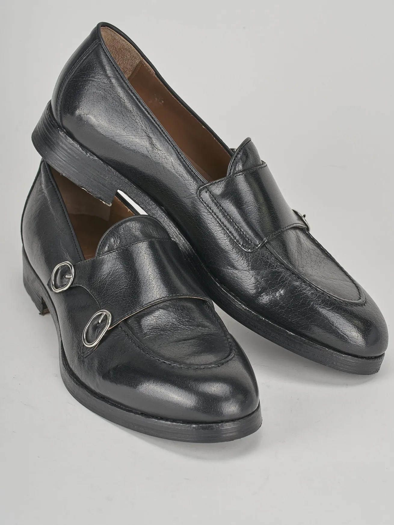 mocassino monk-strap fondo cuoio e soletto interno in vera pelle. tomaia in morbida pelle, punta leggermente ovale, chiusura con due fibbie per un tocco elegante per le tue occasioni speciali.