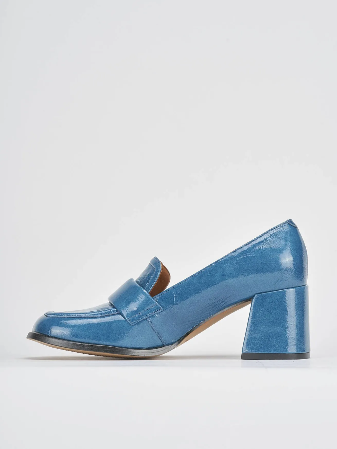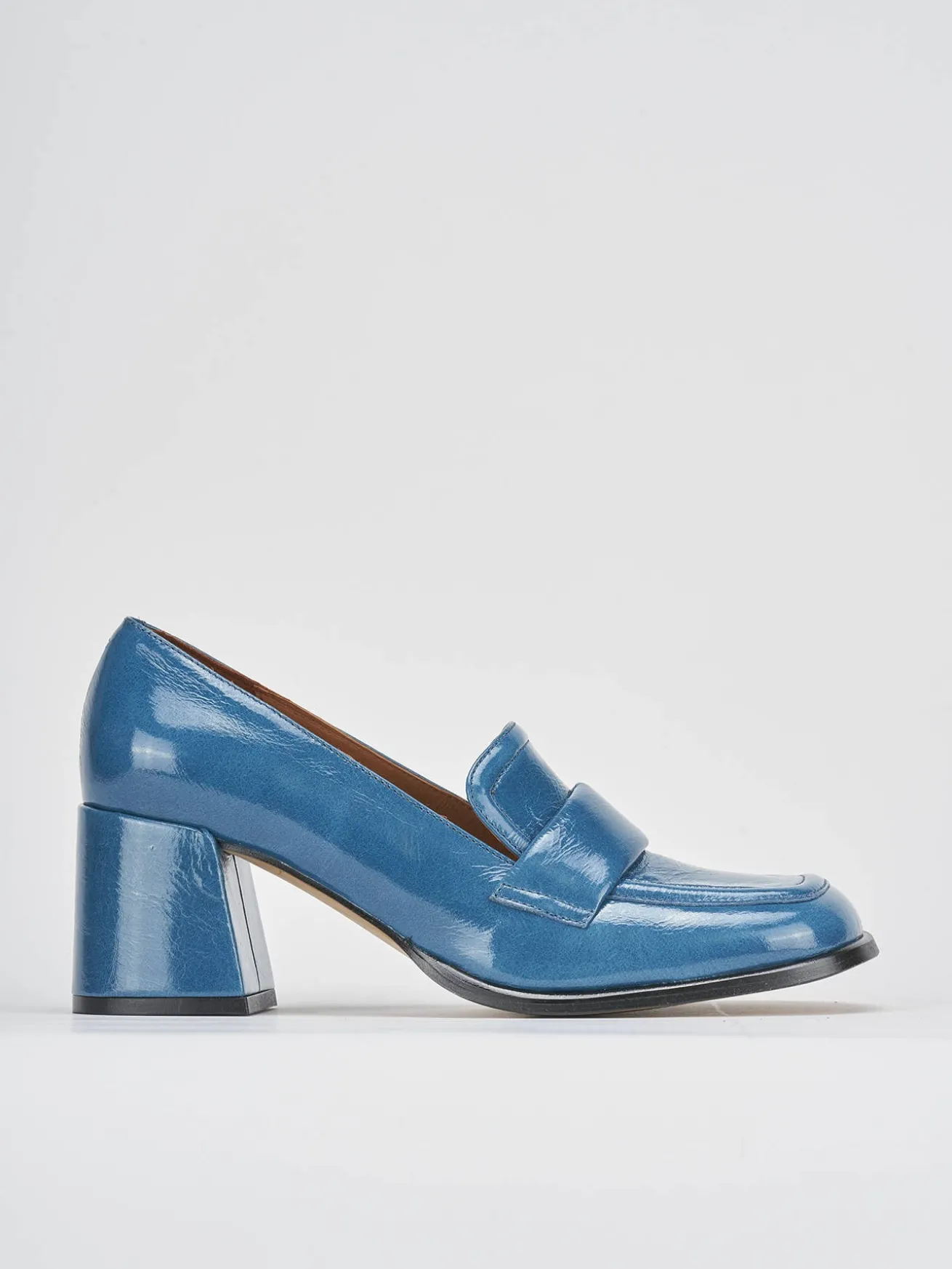 mocassino tacco 8 cm fondo in leggerissima gomma e soletto interno in vera pelle. tomaia in morbida pelle effetto verniciato, punta squadrata, cuciture a mano a vista, mascherina per un look sporty-chic.