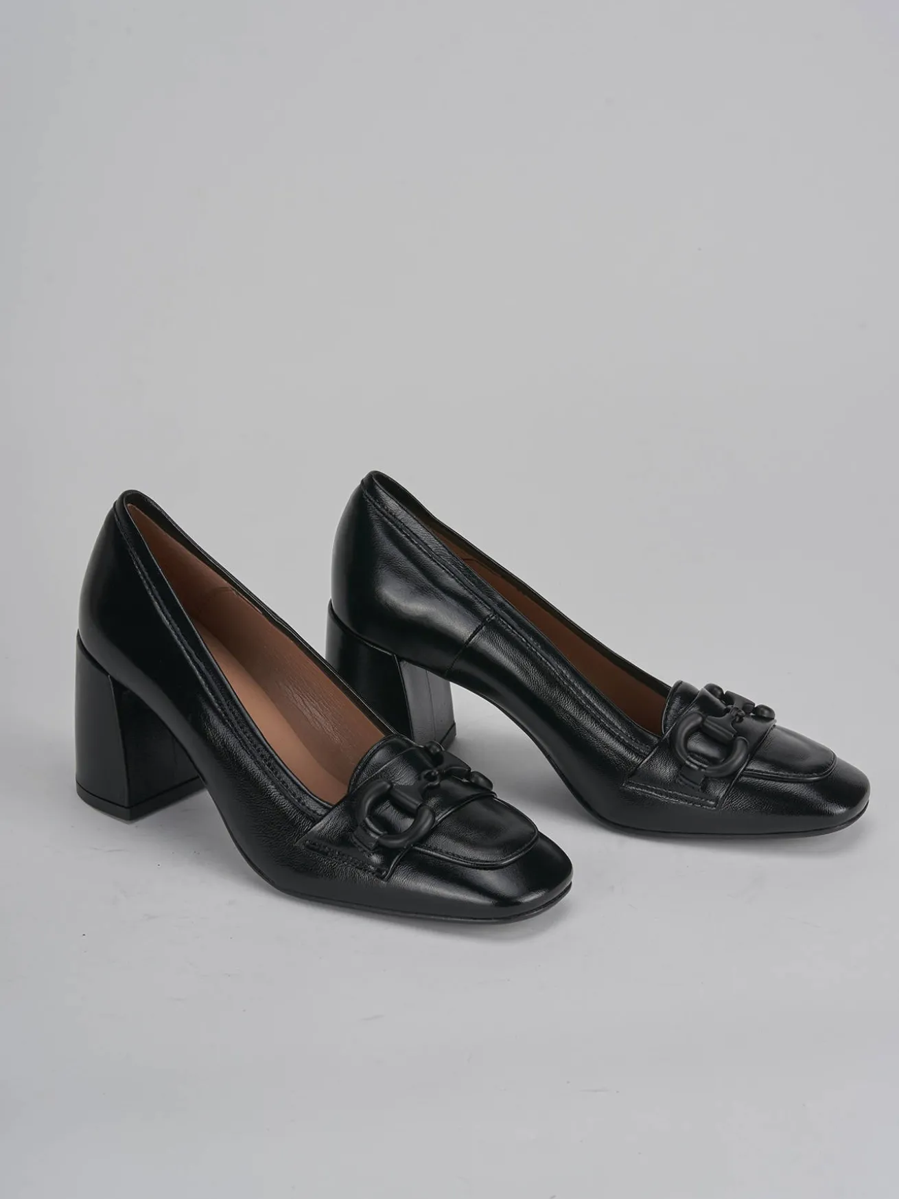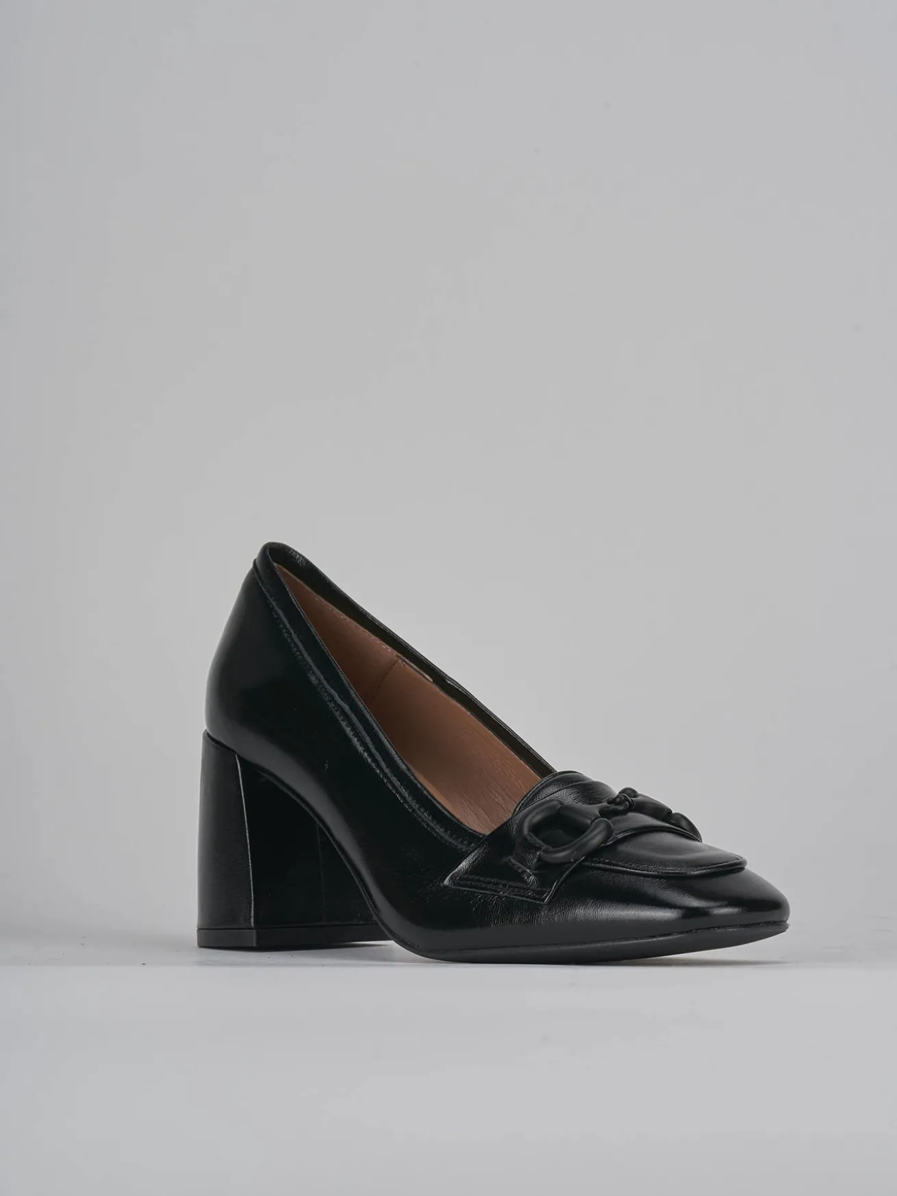 mocassino tacco 7.5cm fondo in gomma e soletto interno in vera pelle. tomaia in morbida pelle effetto vernciato, punta squadrata, cuciture a mano visibili, accessorio in tinta, tacco grosso. perfetto con un paio di jeans o un vestito.