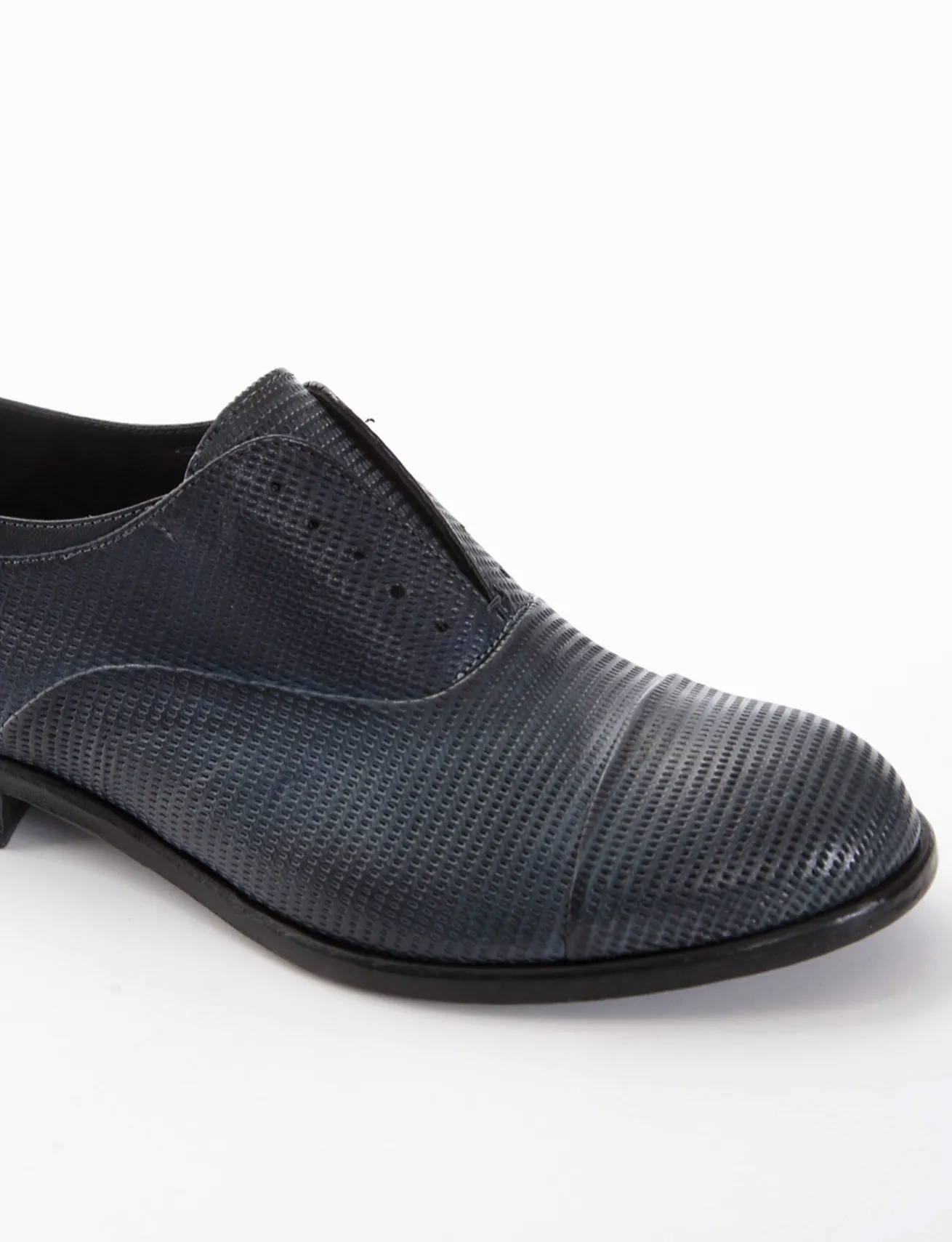 Scarpa no-lace fondo in leggero cuoio e soletto interno in vera pelle. Tomaia in nappa lucente con laseratura effetto artigianale ed elastico sotto alla linguetta per una facile calzata. Laccio a corredo.