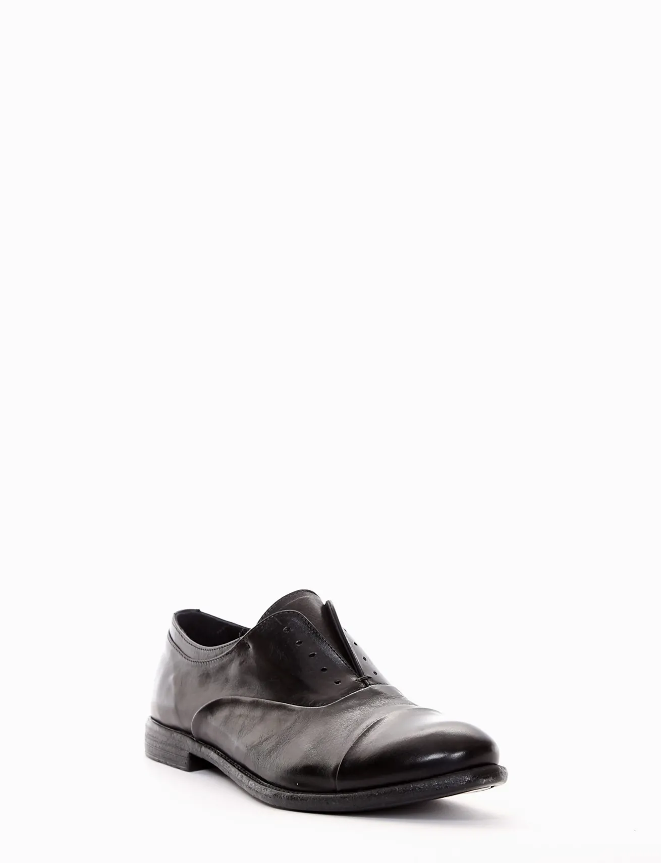 Scarpa no-lace fondo in leggera gomma e soletto interno in vera pelle. Tomaia in nappa lucente con effetto artigianale ed elastico sotto alla linguetta per una facile calzata. Laccio a corredo.