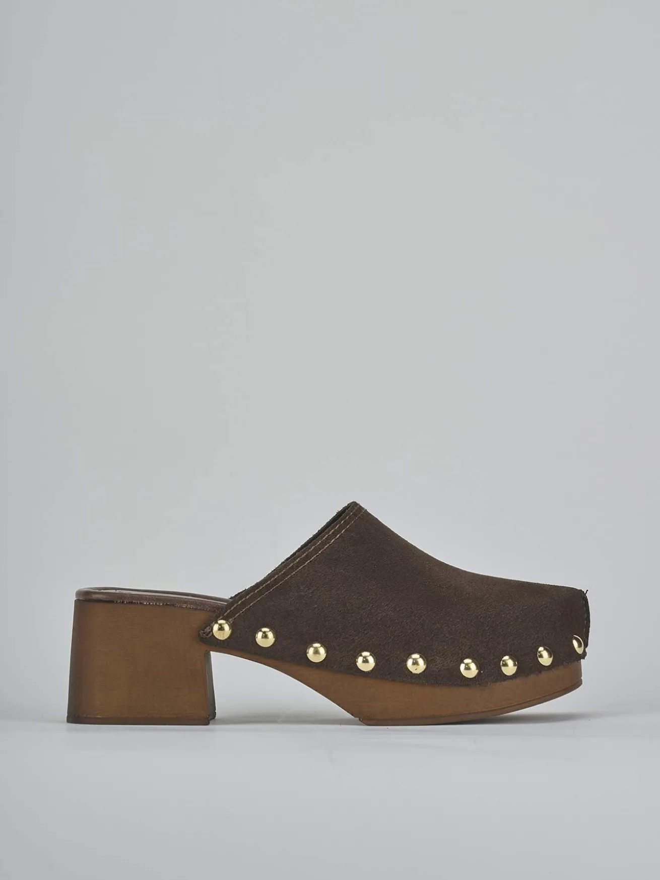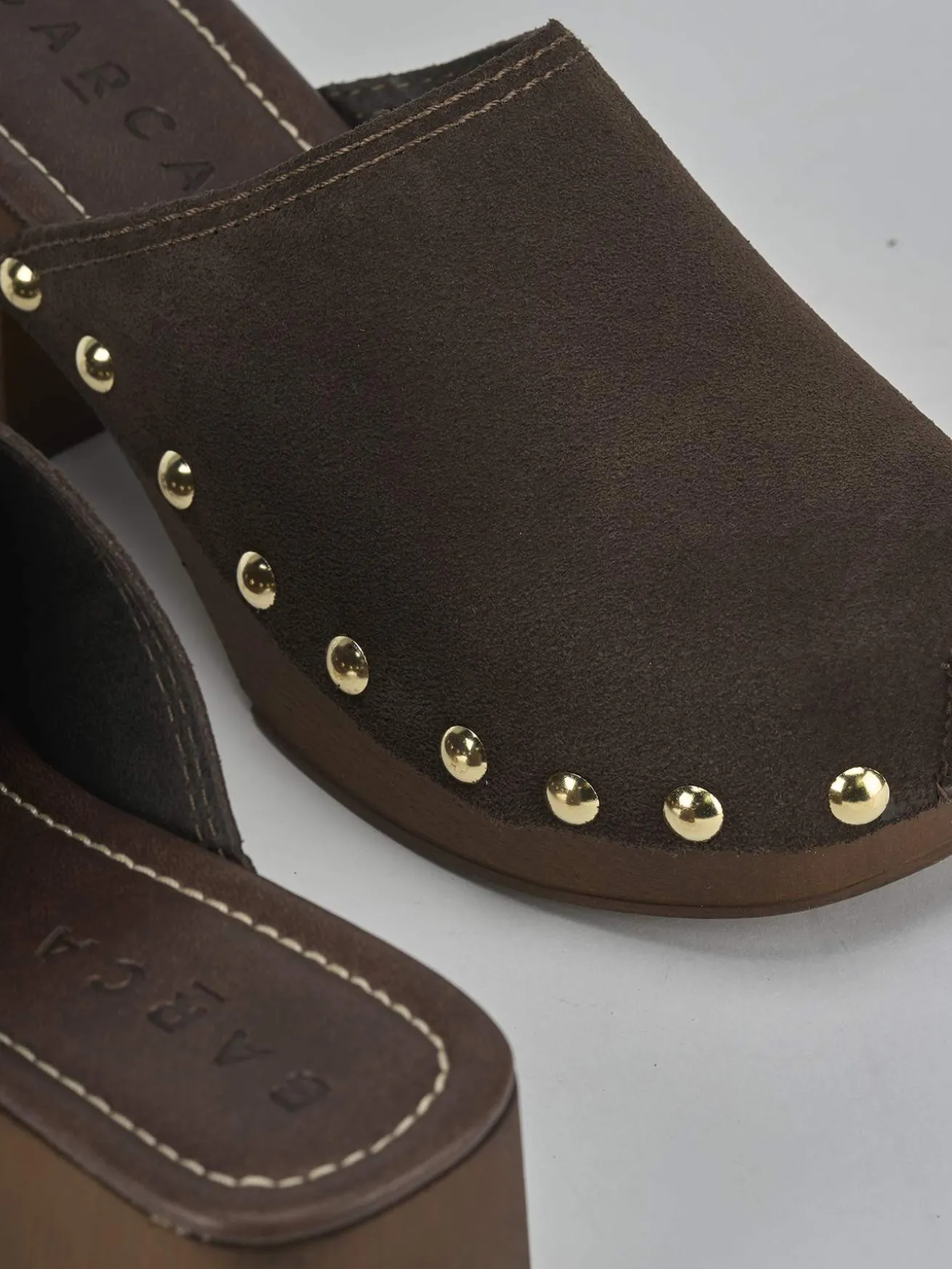 Sabot tacco 5 cm, fondo in gomma e soletto interno in vera pelle. Tomaia in morbido camoscio, punta affusolata, cuciture visibili, borchie laterali e tacco stabile per un look chic.