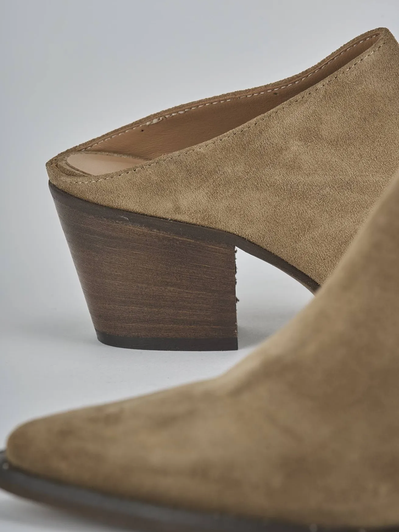 Sabot tacco 6 cm fondo in gomma e soletto interno in vera pelle. Tomaia in morbida pelle scamosciata, punta sfilata, cuciture e tacco grosso stabile. Guardolo sporgente con piccole borchie per un look chic.