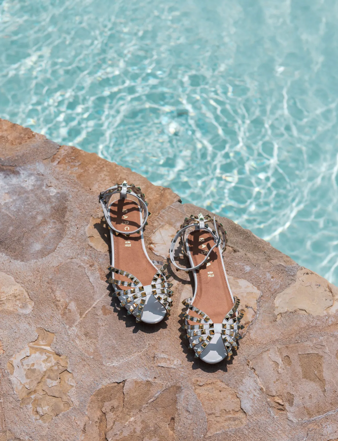 La punta affusolata e le fascette decorate con borchie donano un look cool e contemporaneo.