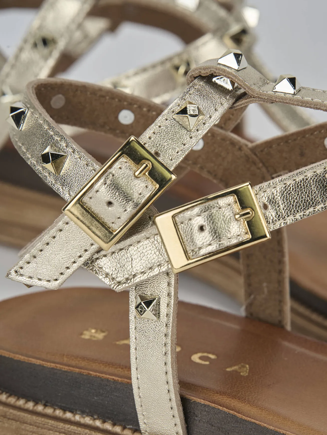 La tomaia in morbida pelle effetto laminato dona un tocco di lucentezza, mentre la punta affusolata e le fasce arricchite da borchie aggiungono un dettaglio chic al tuo look.