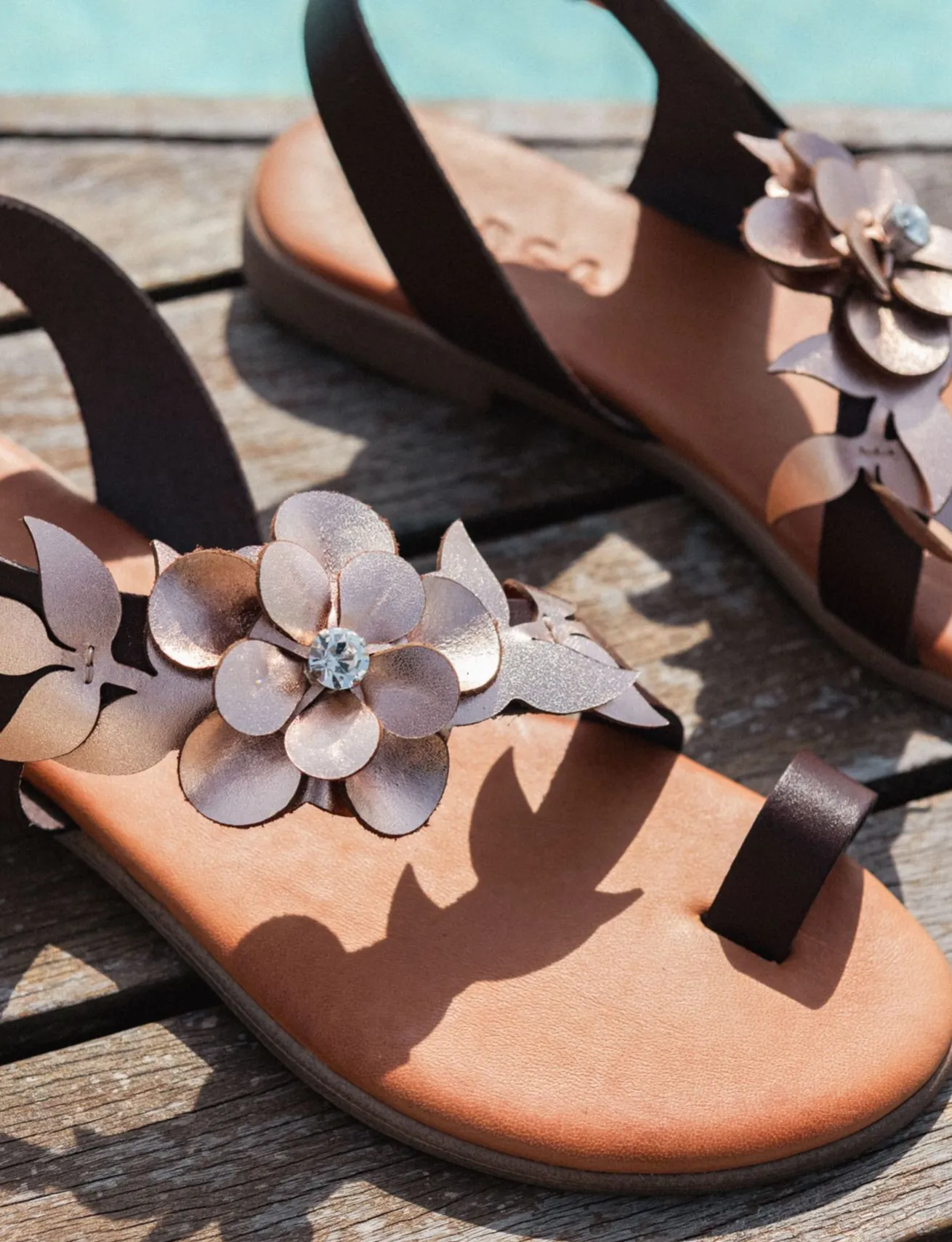 Un dettaglio floreale in camoscio con strass impreziosisce il design, rendendolo perfetto per abbinamenti con vestiti o gonne.