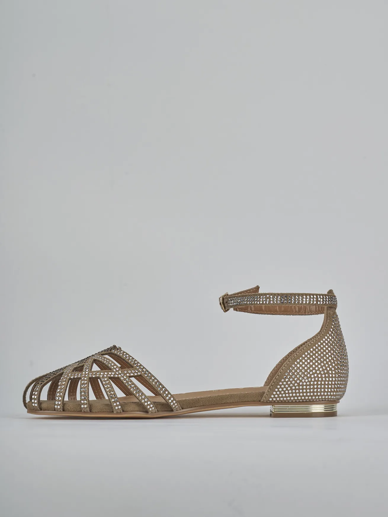 Sandalo tacco 1 cm fondo in leggera gomma e soletto interno in vera pelle. Tomaia in morbido camoscio sostenibile, punta affusolata, fascette in punta a ragnetto, strass, cinturino in caviglia con fibbia regolabile. Tacco stabile e in metallo per un look cool.