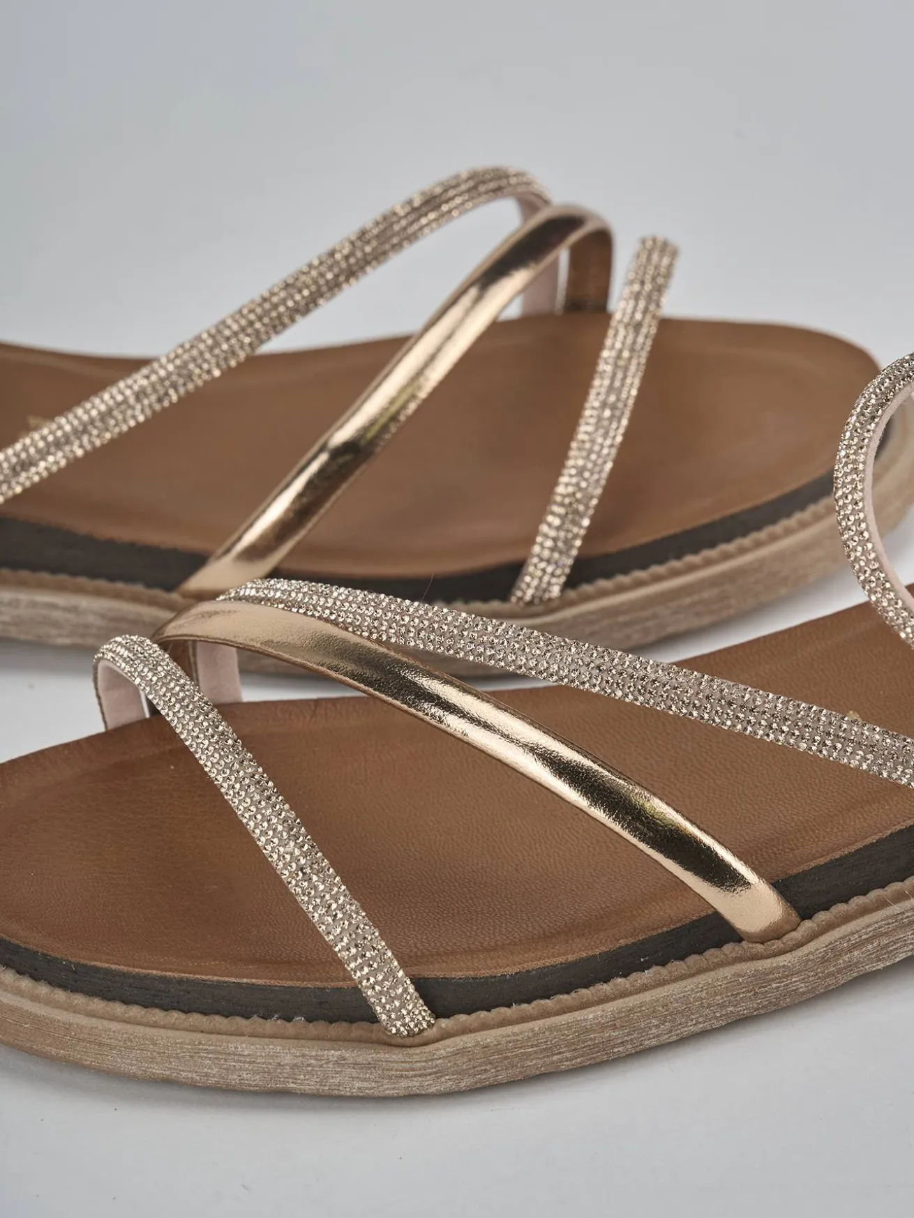 Sandalo tacco 2 cm fondo in leggerissima gomma e soletto interno in vera pelle. Tomaia in morbida pelle, punta affusolata, fascette singole in pelle laminata e strass e cinturino ad anello. Semplice ed elegante, perfetto per ogni occasione.