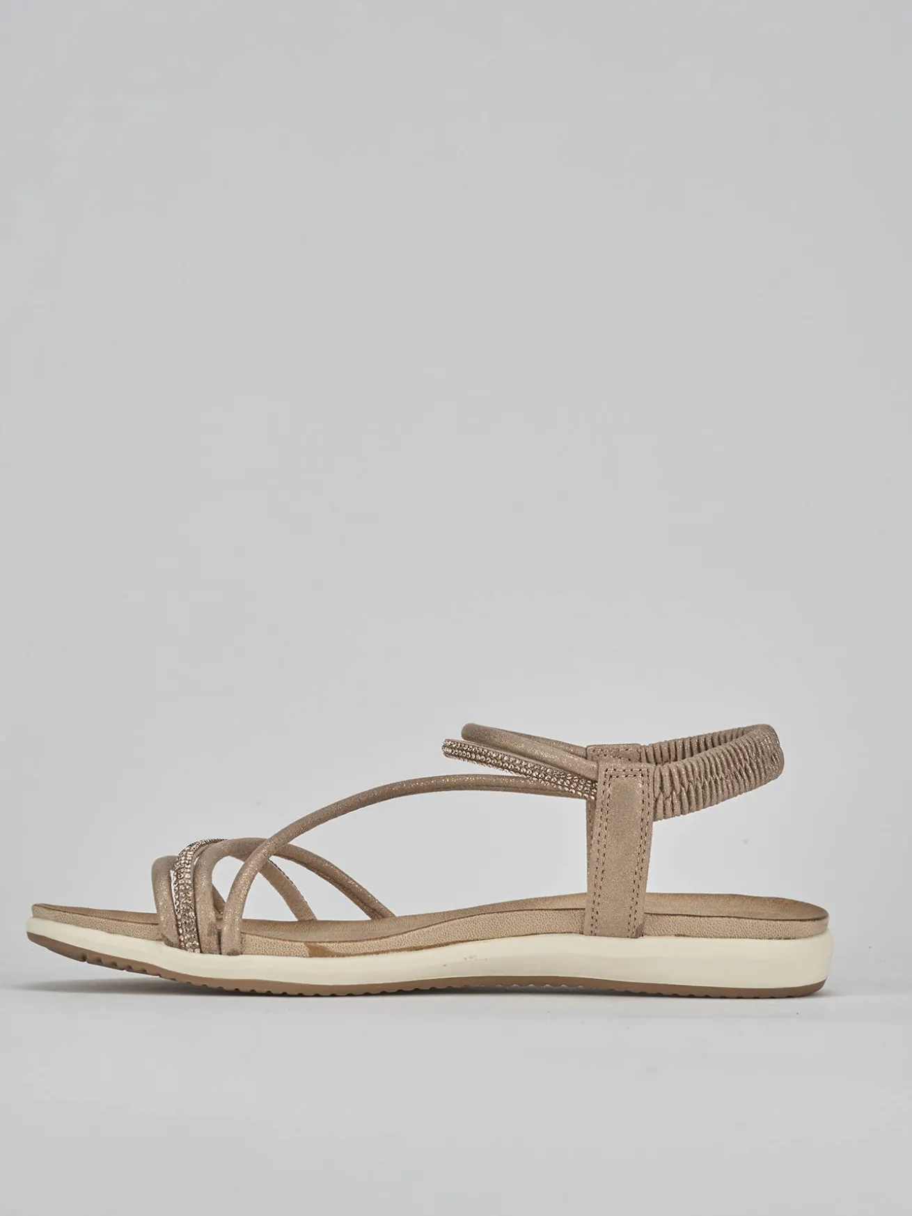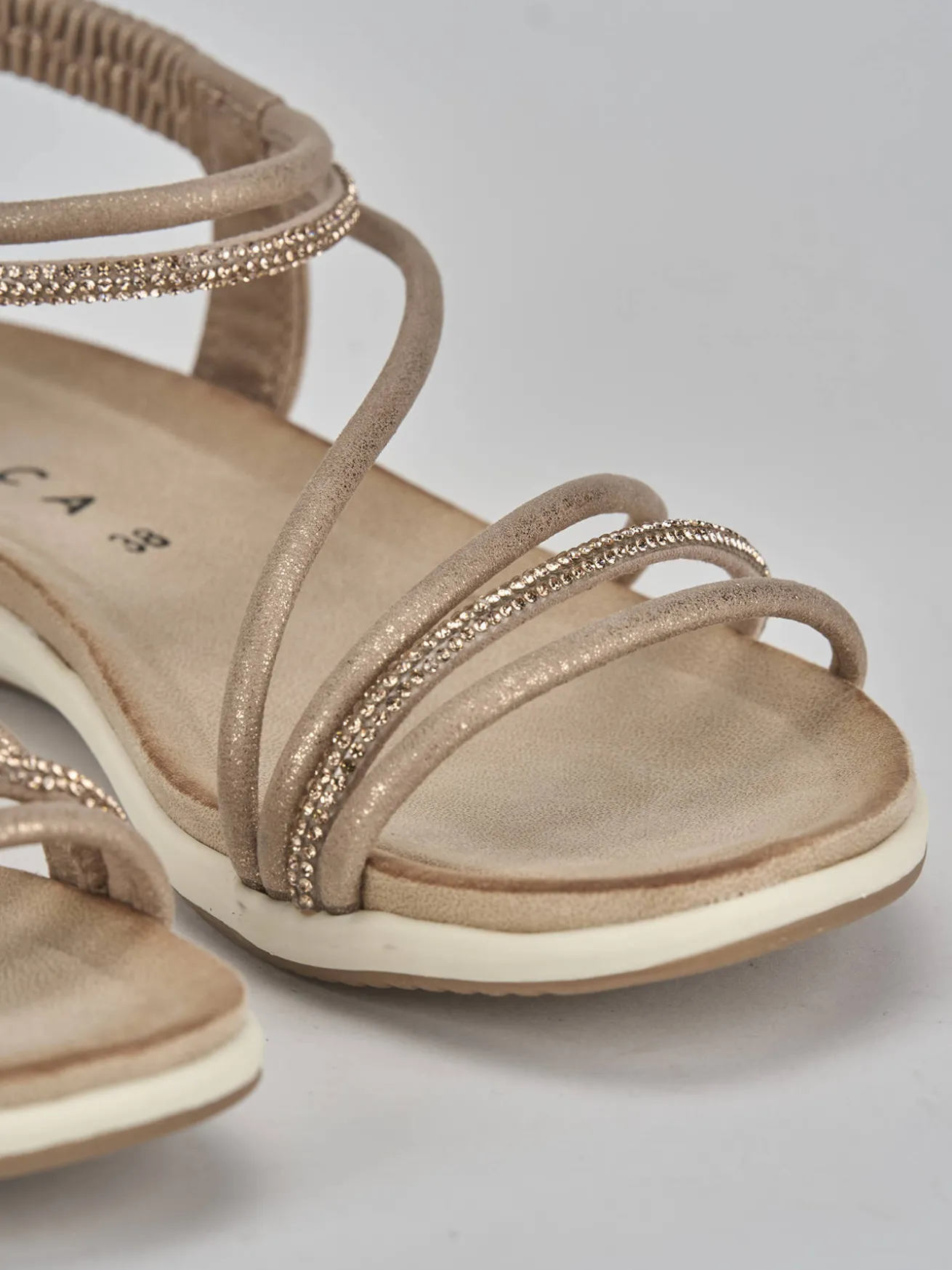 Sandalo tacco 1 cm fondo in leggera gomma e soletto interno in vera pelle. tomaia in morbida pelle, punta affusolata, tre fasce sottili, anelli in caviglia con strass e piccolo platform di 2 cm per un look chic.