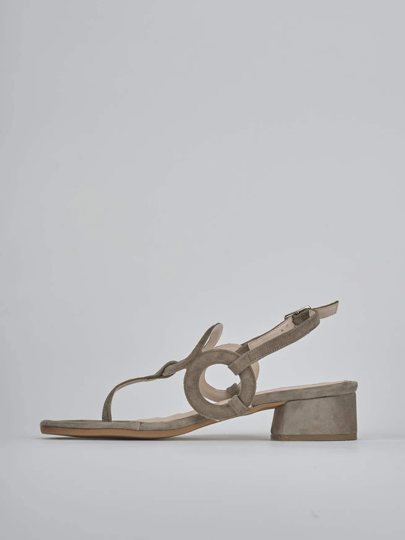 Sandalo tacco 3 cm fondo in leggerissima gomma e soletto interno in vera pelle. Tomaia in morbida pelle scamosciata, punta leggermente squadrata, infradito, motif a cerchi e cinturino con fibbia regolabile e tacco stabile. Perfetto con un vestito.