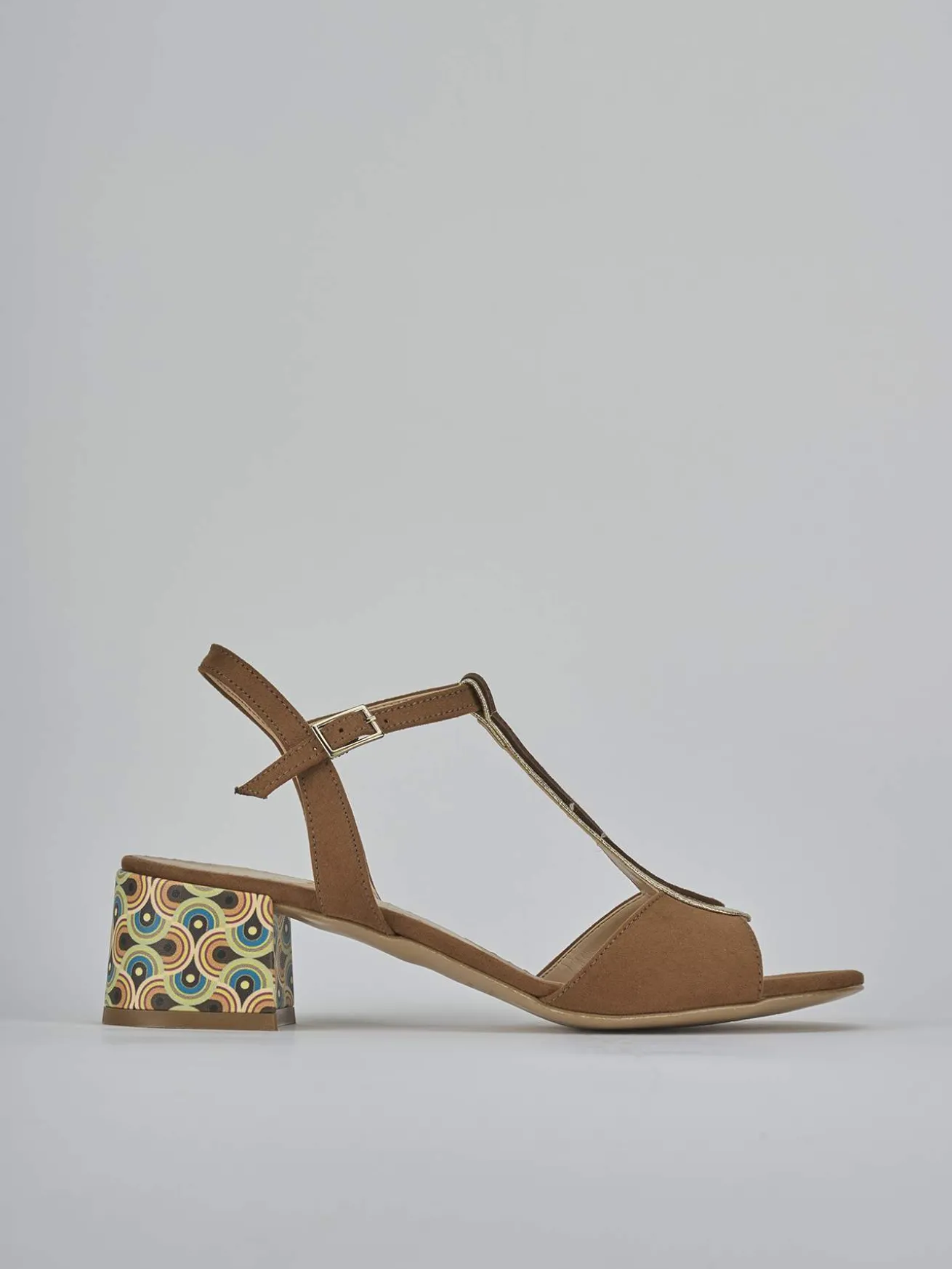 Sandalo tacco 5 cm fondo in leggerissima gomma e soletto interno in vera pelle. Tomaia in morbida pelle scamosciata, punta affusolata, bordo a goccia a contrasto che diventa cinturino a ‘T’ con fibbia regolabile. Particolarissimo tacco grosso fasciato con stampa geometric per il massimo del comfort-chic.