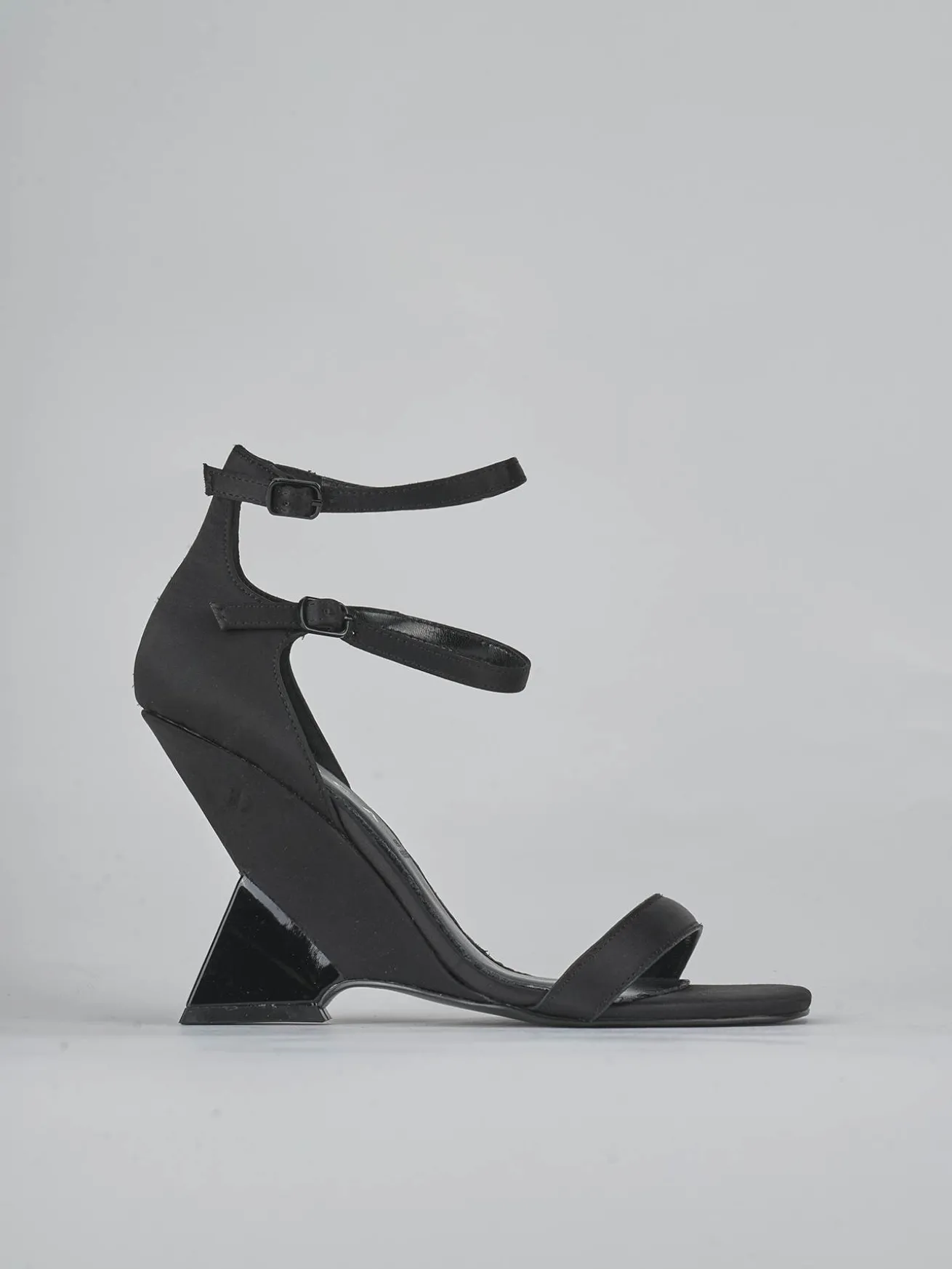 Sandalo zeppa 5 cm fondo in leggera gomma e soletto interno in vera pelle. Tomaia in morbida pelle ricoperta da raso, punta squadrata, fascia unica, due cinturini in caviglia con fibbia regolabile e nuovissimo tacco pieno per un look cool.