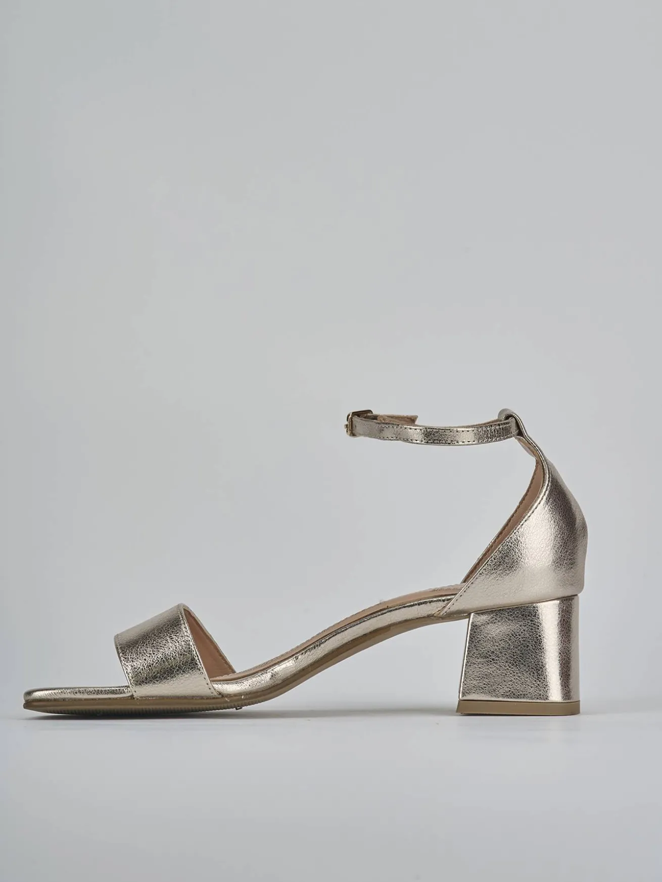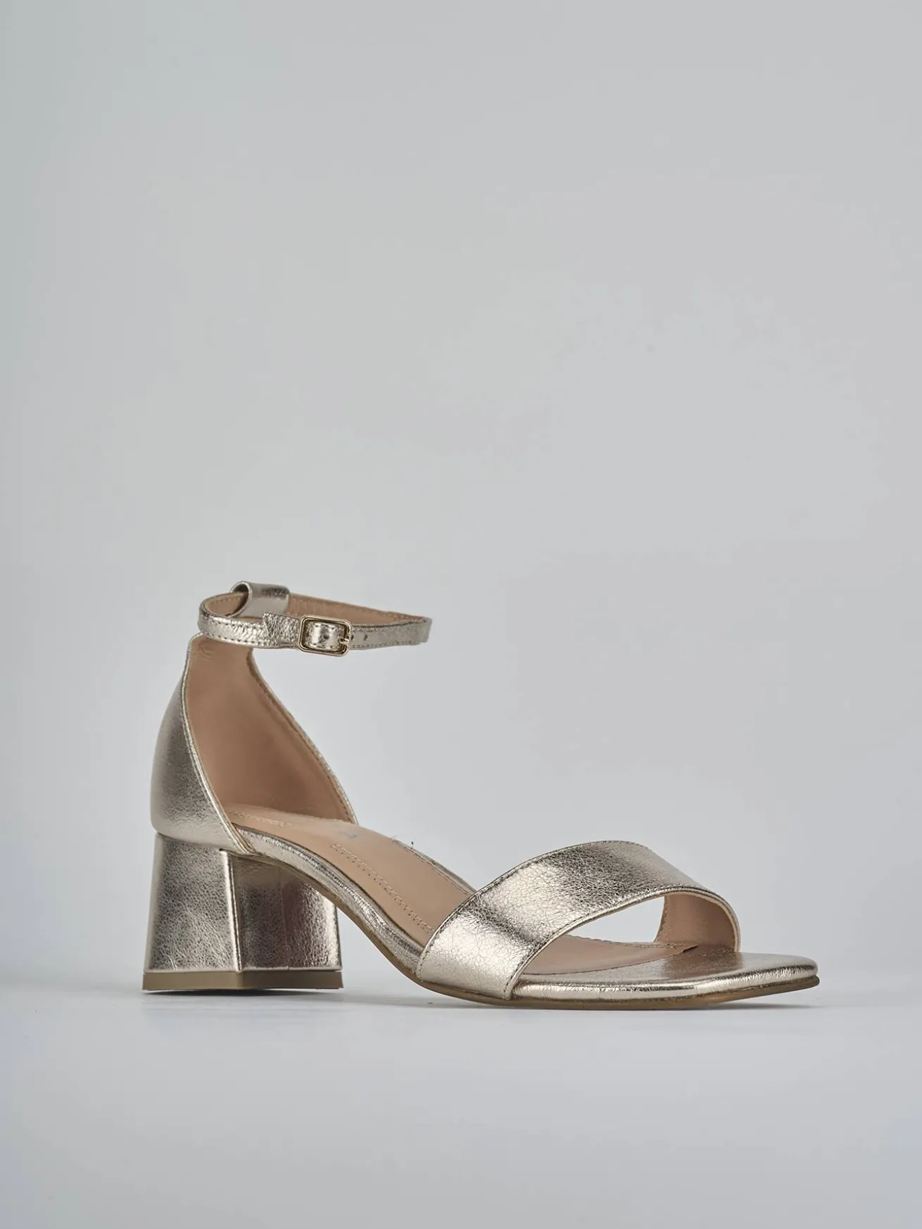 Sandalo tacco 5 cm fondo in leggera gomma e soletto interno in vera pelle. Tomaia in morbida pelle, punta leggermente squadrata, fascia unica in punta, cinturino in caviglia con fibbia regolabile e tacco grosso.