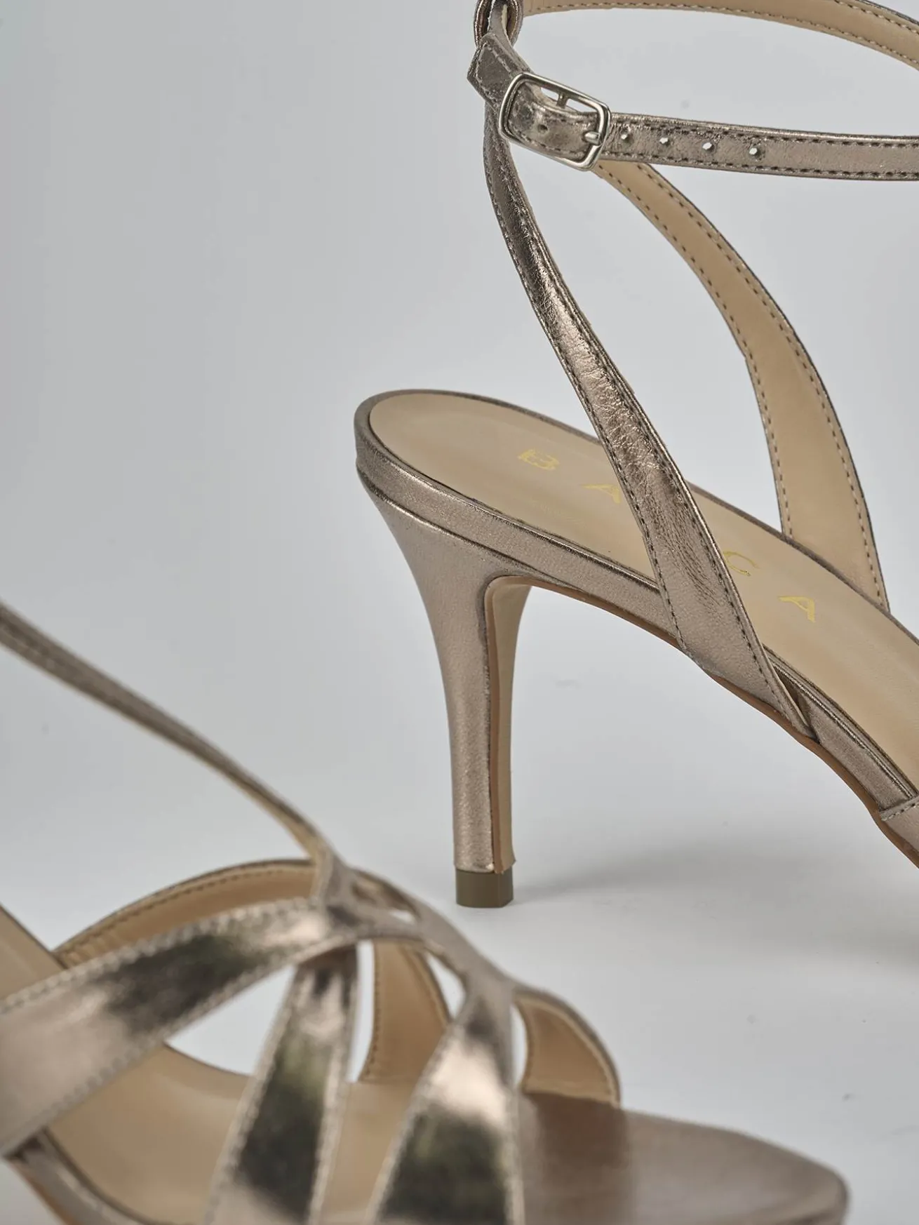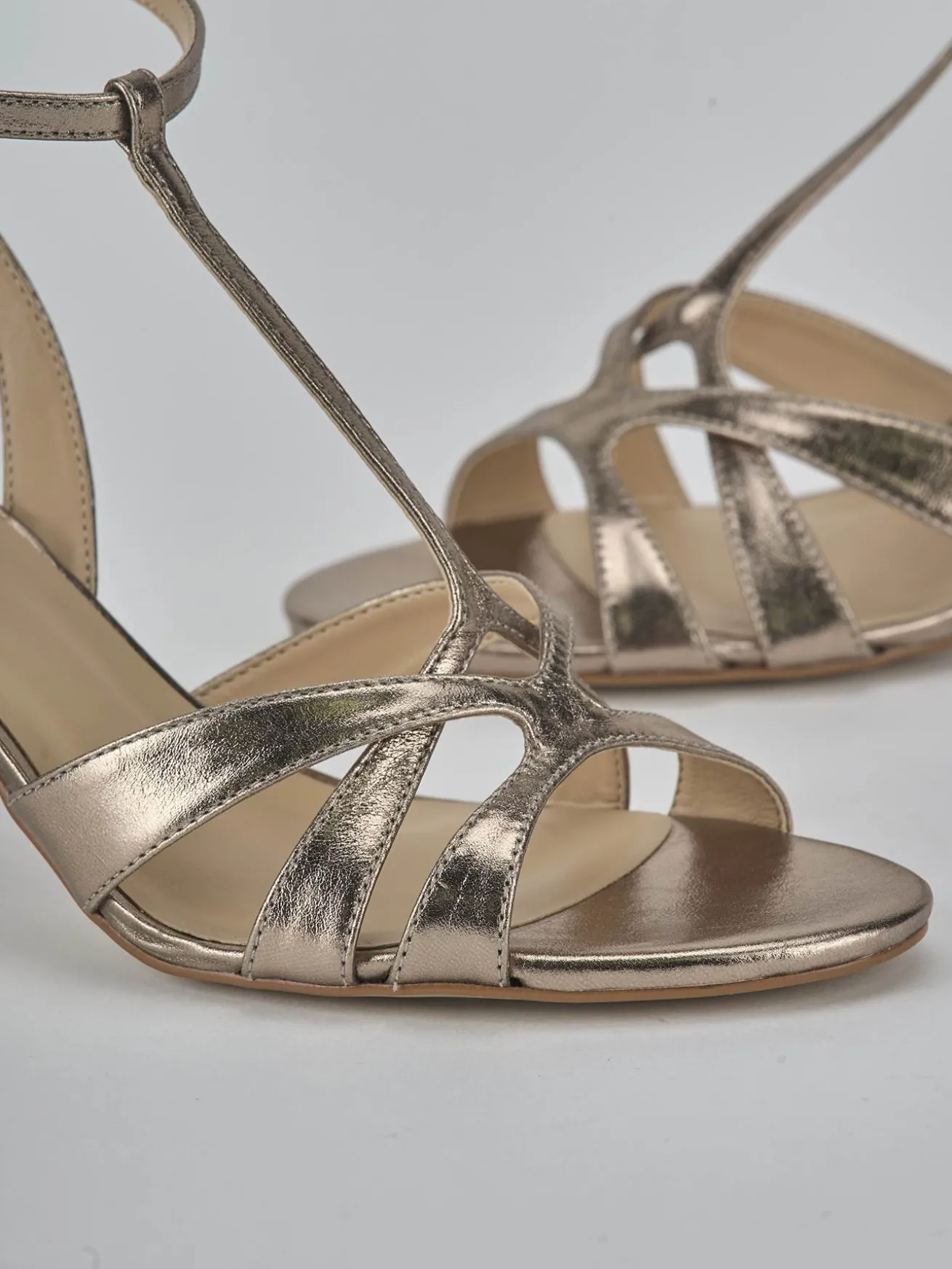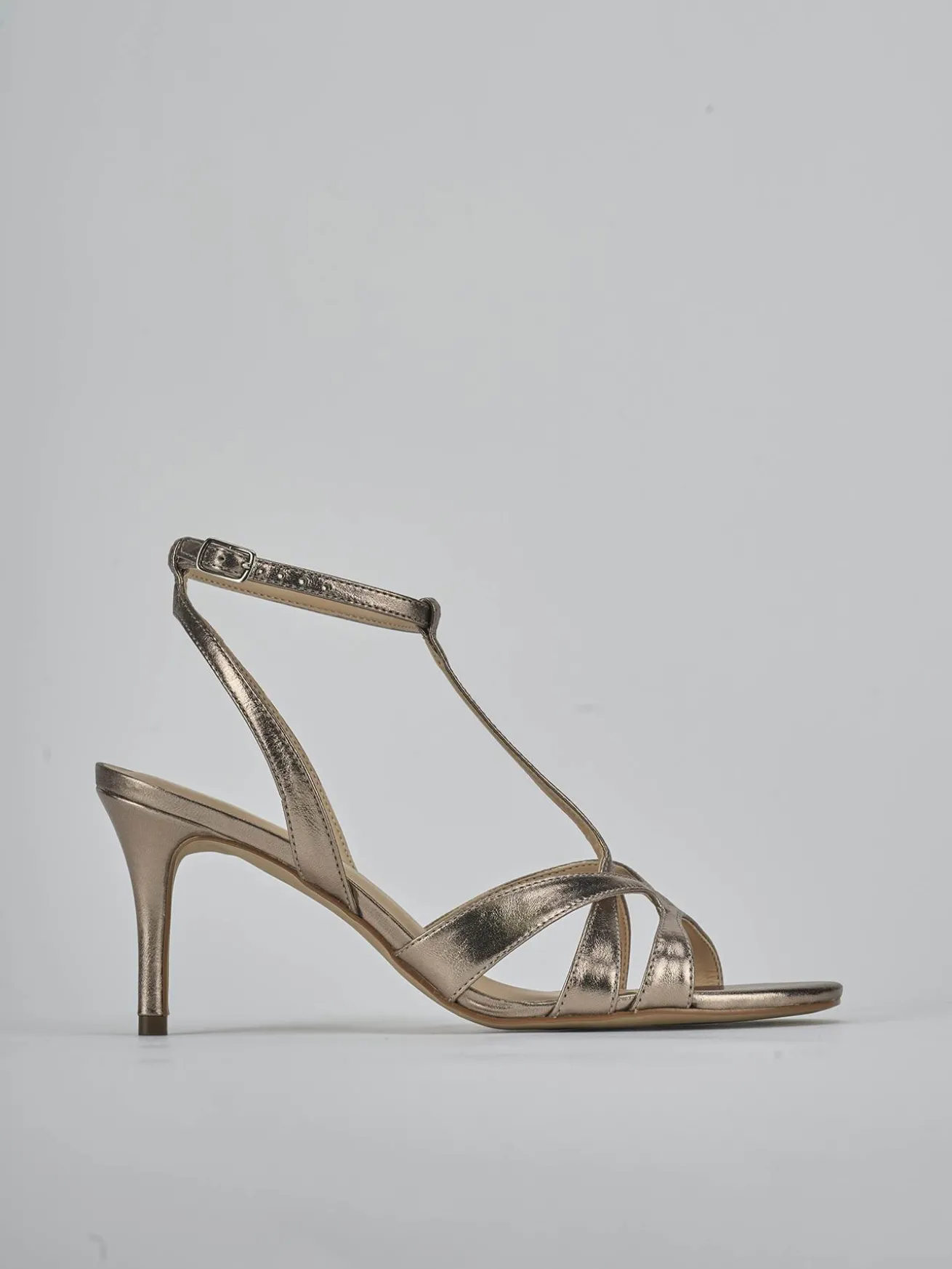 Sandalo tacco 6 cm fondo in leggerissima gomma e soletto interno in vera pelle. Tomaia in morbida pelle, punta affusolata, fascette e cinturino a ‘T’ con fibbia regolabile e nuovissimo tacco rocchetto per un look chic. Ideale anche come sandalo cerimonia per le tue occasioni piu’ importanti.
