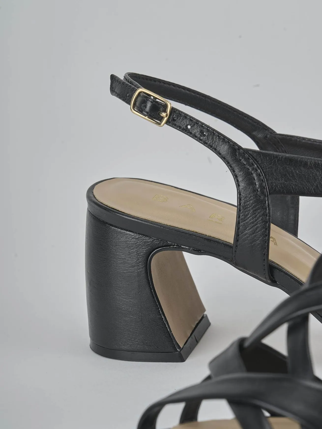 Sandalo tacco 6 cm fondo in leggerissima gomma e soletto interno in vera pelle. Tomaia in morbida pelle, punta leggermente squadrata, fascette incrociate e cinturino con fibbia regolabile e tacco grosso. Dal design che dura nel tempo, perfetto con qualsiasi outfit.