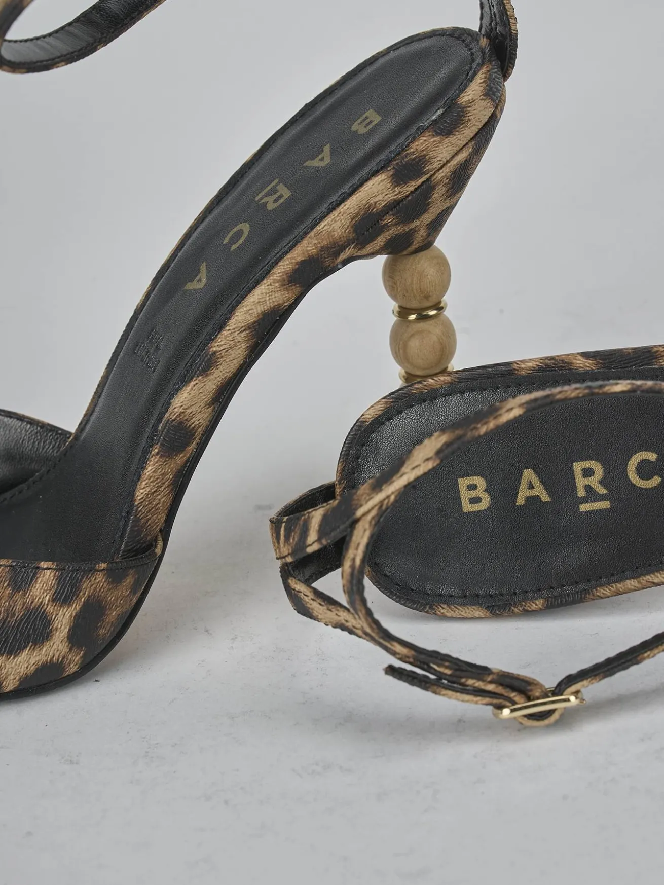Sandalo tacco 8 cm fondo in leggera gomma e soletto interno in vera pelle. Tomaia in morbida pelle stampata leorpardo, punta sfilata, fascia con taglio geometrico, cinturino in caviglia con fibbia regolabile e tacco particolare con strass e perle. Per un look che ti farà notare.