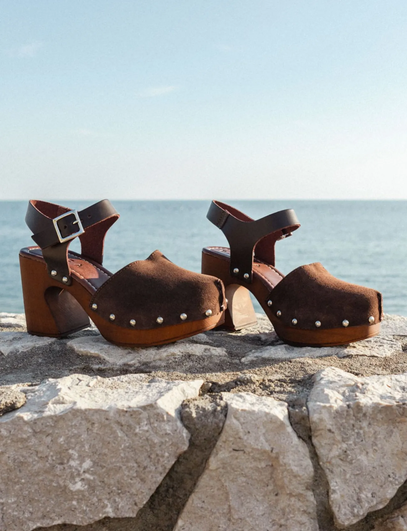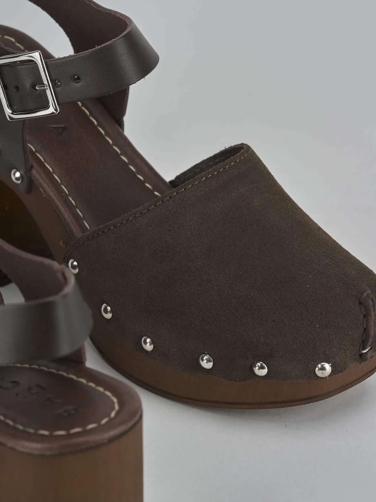Sandalo tacco 9 cm fondo in gomma e soletto interno in vera pelle. Tomaia in morbido camoscio, punta affusolata, cinturino con fibbia regolabile in caviglia, borchie piccole laterali e tacco grosso stabile. Piccolo plateau di 1 cm anteriore. Ideale sia con un paio di jeans sia con una gonna.