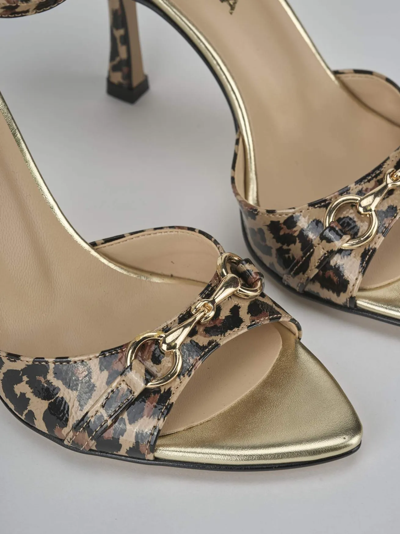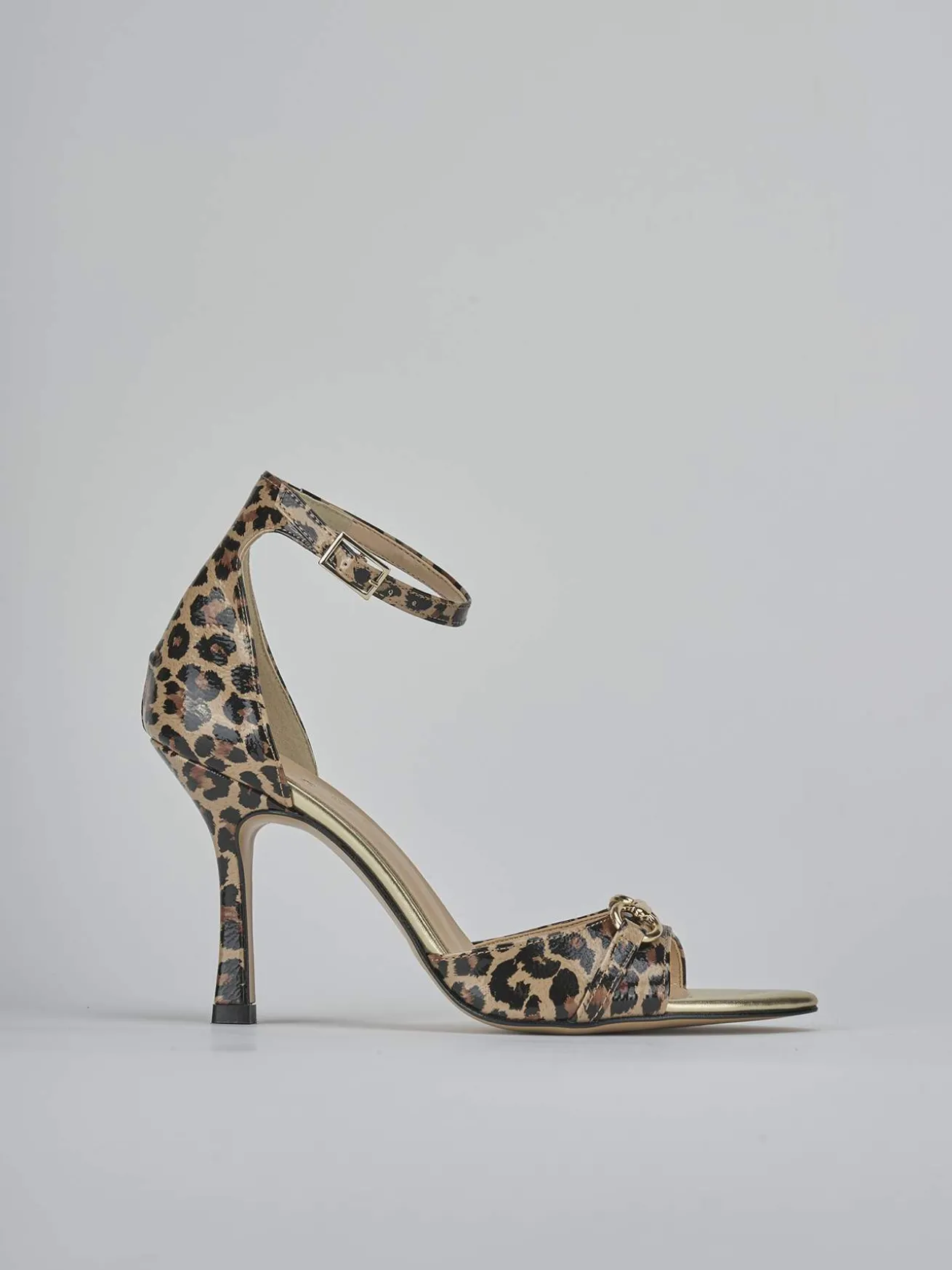 Sandalo tacco 9 cm fondo in gomma e soletto interno in vera pelle. Tomaia in morbida pelle foderata in tessuto, punta sfilata, fascia unica, mosrsetto, cinturino in caviglia con fibbia regolabile e tacco rocchetto. Perfetto per un tocco fun ai tuoi look.