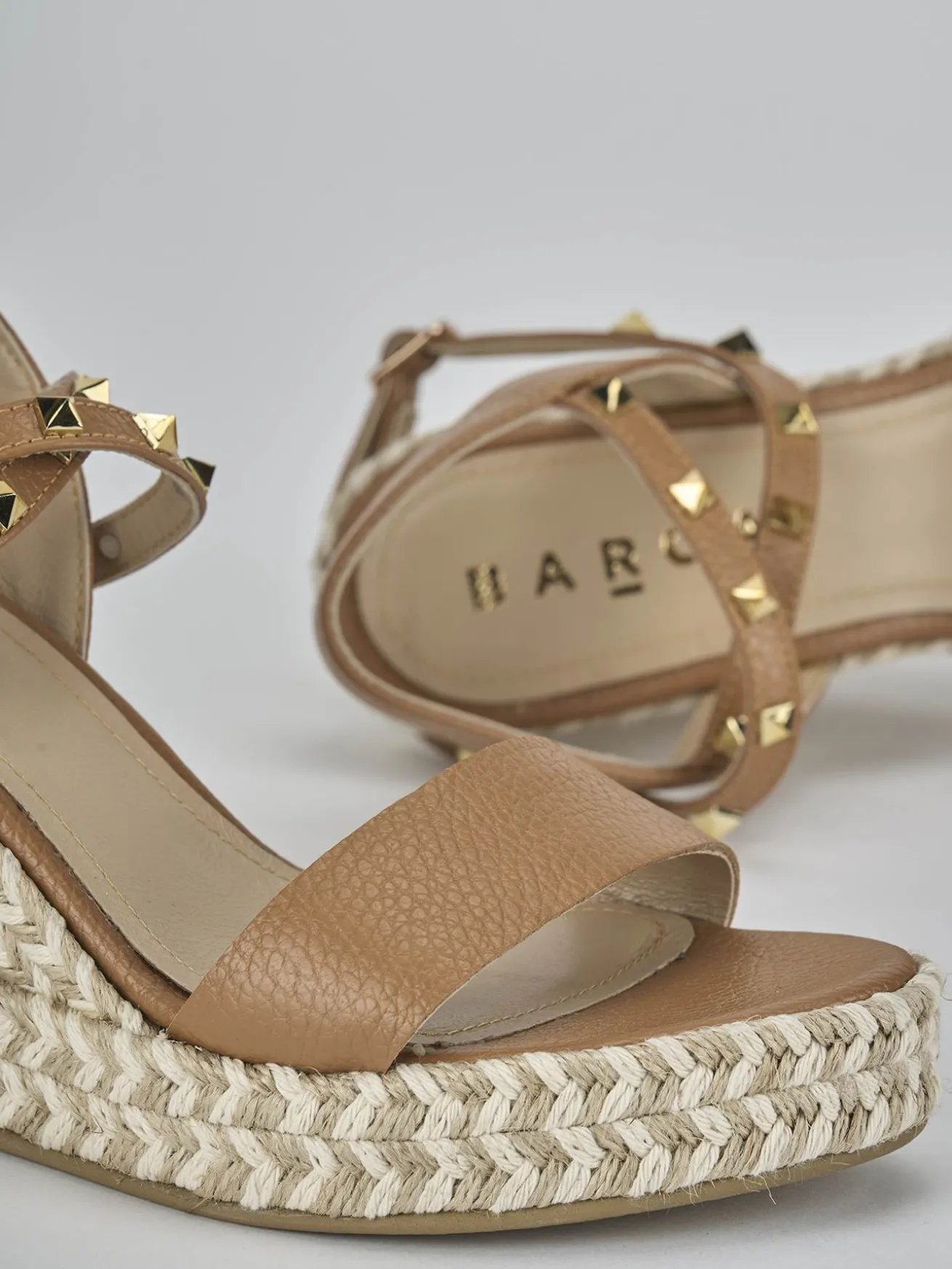 Sandalo zeppa 9 cm fondo in leggerissima gomma e soletto interno in vera pelle. Tomaia in morbida pelle, punta affusolata, fascia unica in punta, cinturini incrociati in caviglia con fibbia regolabile e borchie per un tocco cool ai tuoi look.