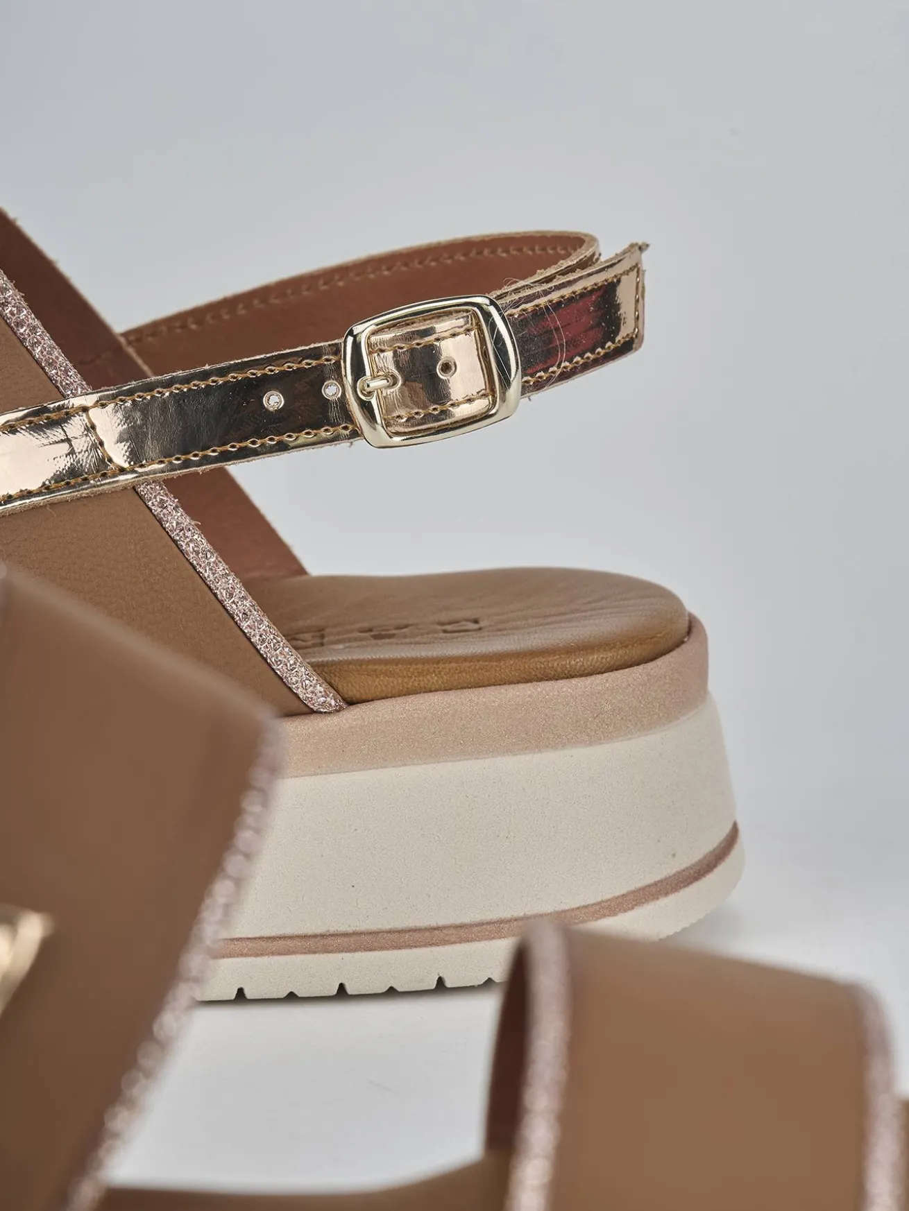 Sandalo zeppa 3 cm fondo in leggera gomma e soletto interno in vera pelle. Tomaia in morbida pelle, punta affusolata, fasce con rifiniture in laminato a contrasto e cinturino con fibbia regolabile. Perfetto con un vestito ampio e fresco.
