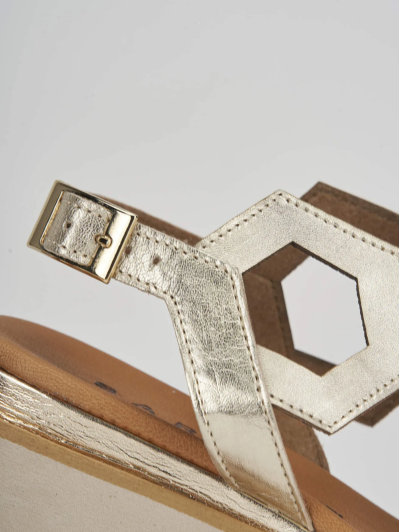 sandalo zeppa 3 cm fondo in leggerissima gomma e soletto interno in vera pelle. tomaia in morbida pelle laminata, punta arrotondata, forme geometriche e cinturino regolabile per un look cool.