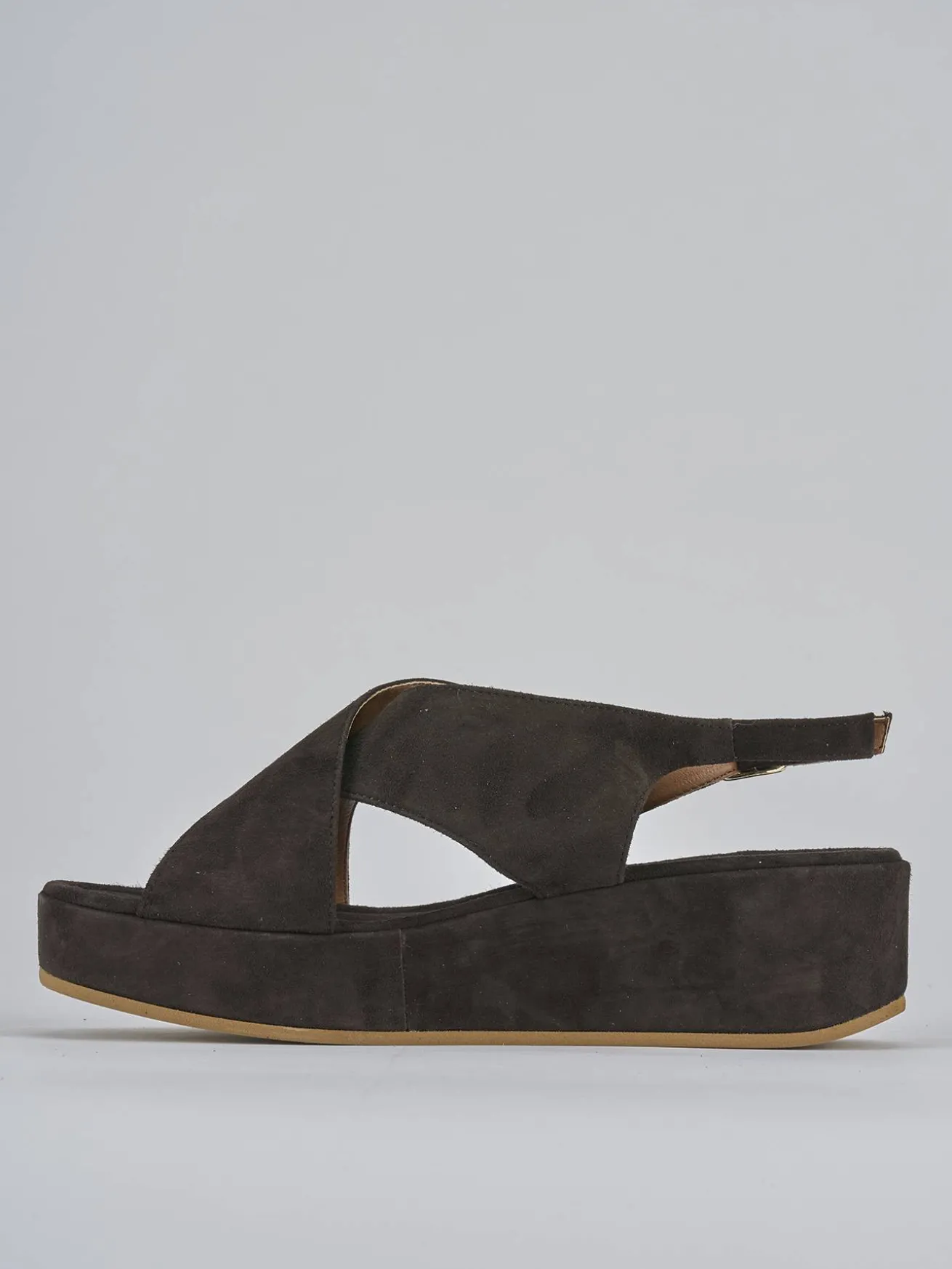 Sandalo zeppa 4 cm fondo in cuoio e soletto interno in vera pelle e leggermente imbottito. Tomaia in morbida pelle scamosciata, punta leggermente squadrata, fasce incrociate, cinturino con fibbia regolabile e piccolo plateau anteriore di 1.5 cm . Perfetto con un vestito o una gonna midi.