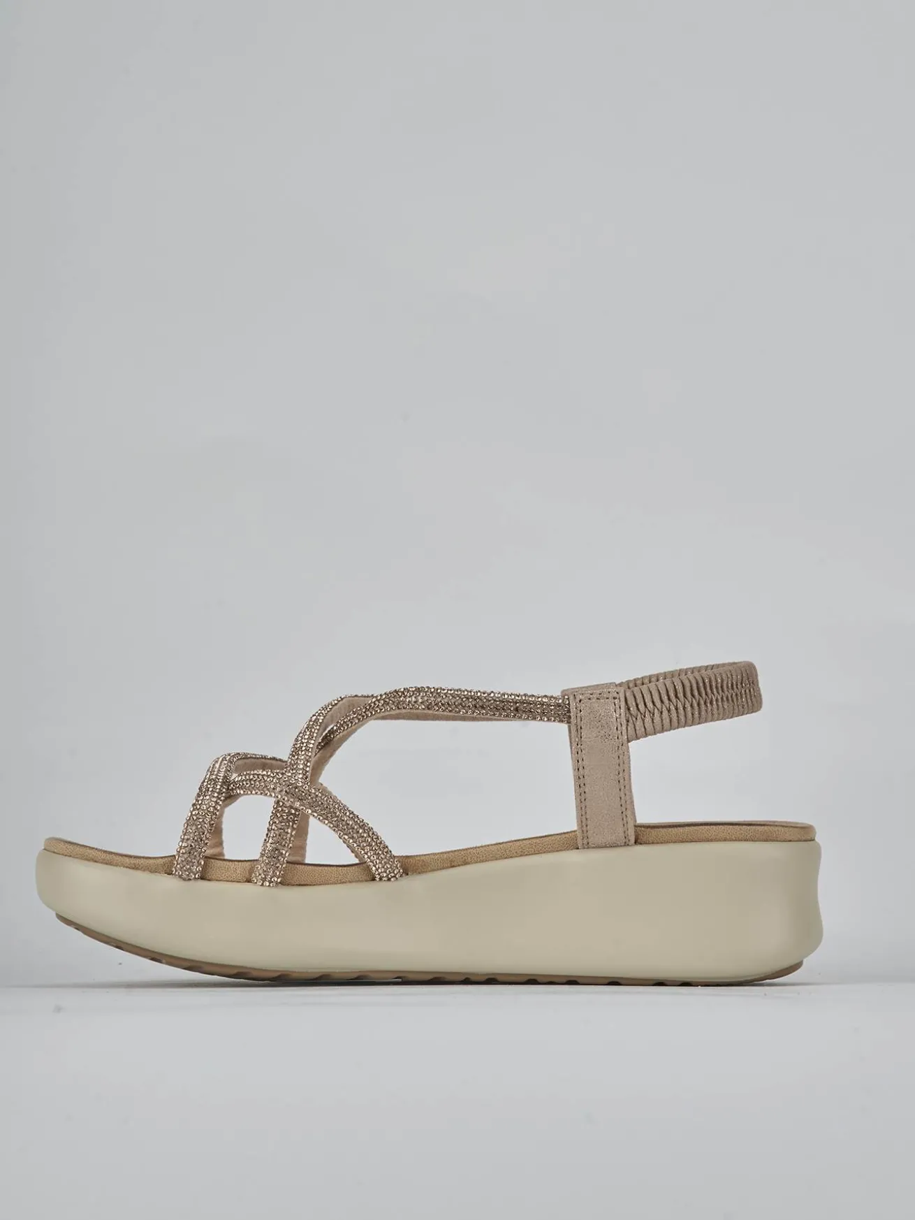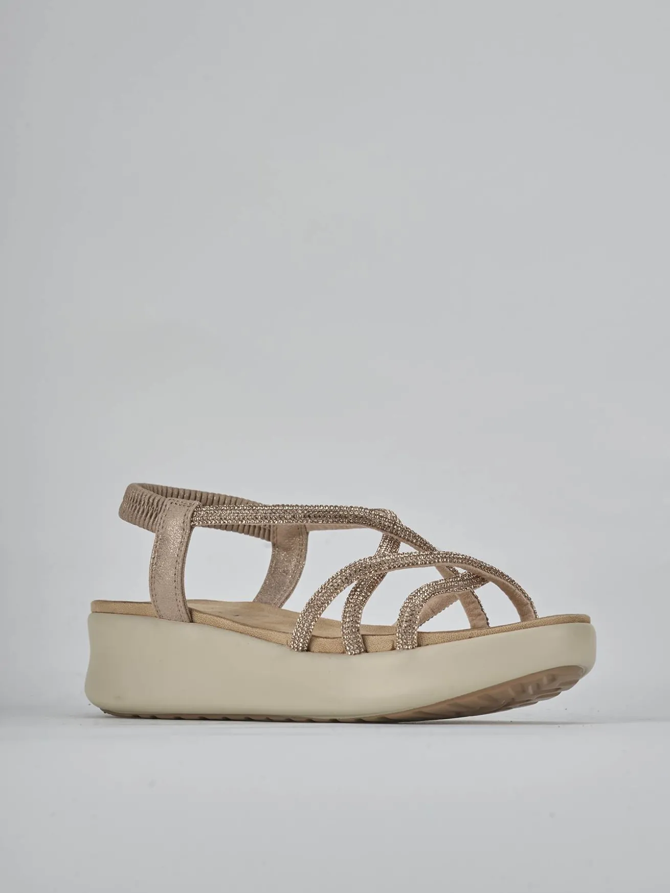 Sandalo zeppa 4 cm fondo in leggera gomma e soletto interno in vera pelle. Tomaia in morbida pelle foderata in tessuto, punta affusolata, fasce sottili incrociate con strasse cinturino elasticizzato. Piccolo plateau antriore di 2 cm per il massimo del comfort.
