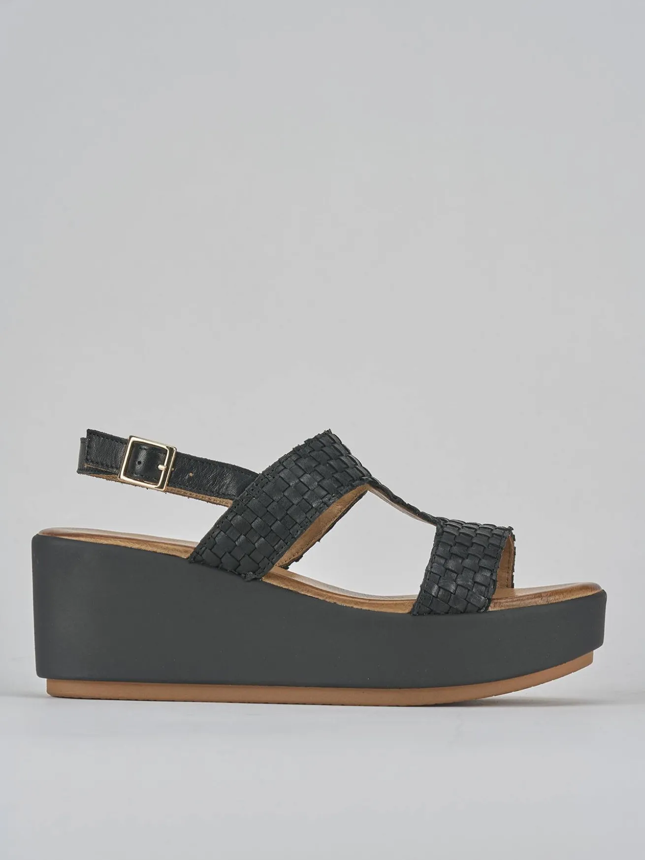 Sandalo zeppa 6 cm fondo in leggera gomma e soletto interno in vera pelle. tTmaia in morbida pelle finemente intrecciata, punta affusolata, fascia a ‘T’ con cinturino con fibbia regolabile. Perfetto con una gonna e una t-shirt.