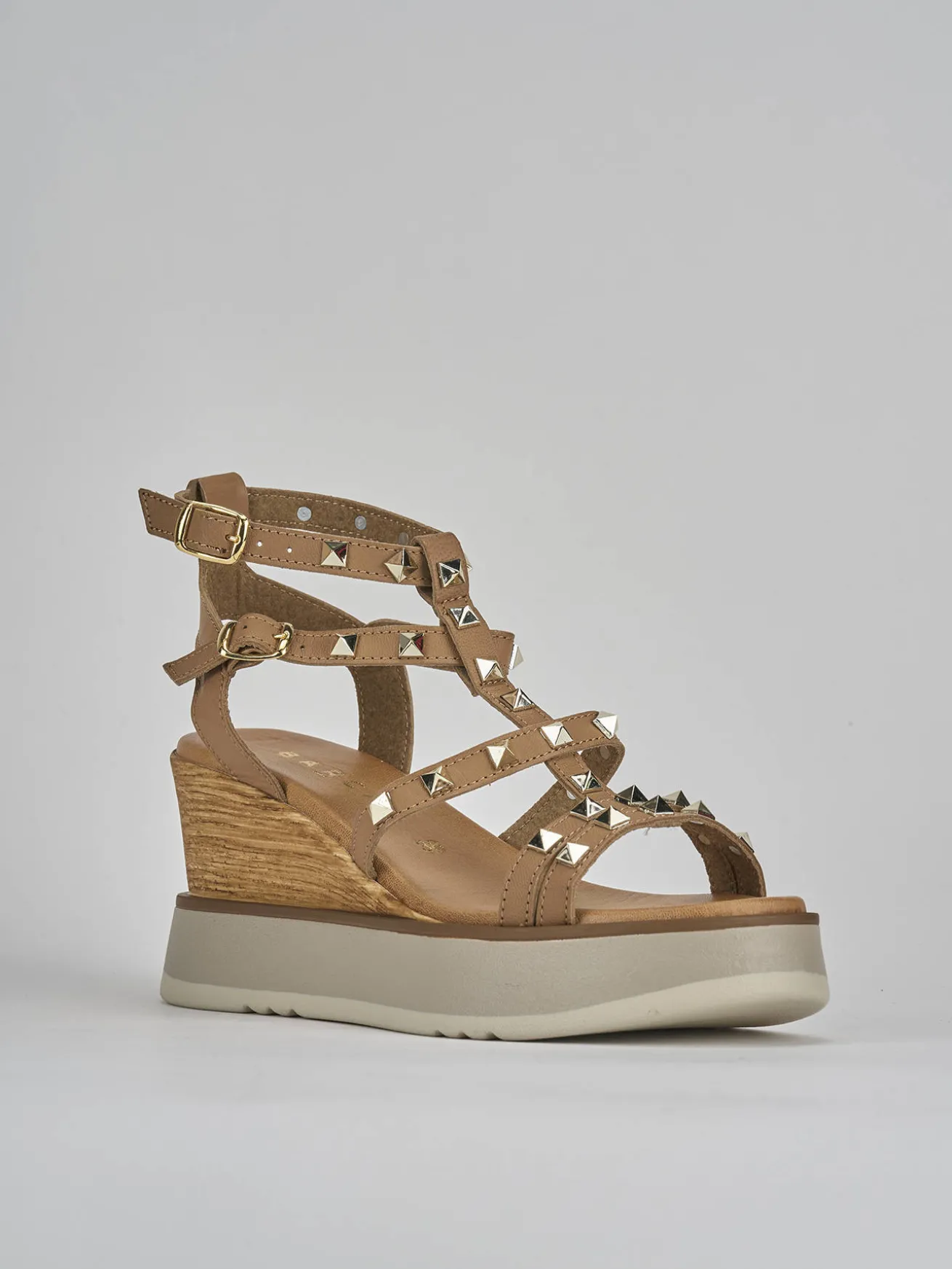 Sandalo zeppa 8 cm fondo in leggeerissima gomma e soletto interno in vera pelle. Tomaia in morbida pelle, punta affusolata, fascette e cinturini con fibbia regolabile, borchie. Perfetta con una gonna ampia oppure dei jeans a zampa di elefante. Plateaux anteriore 3cm.