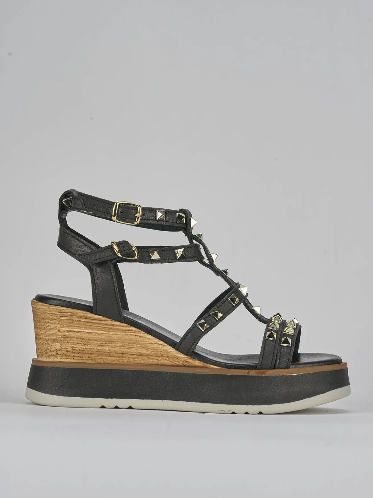 Sandalo zeppa 8 cm fondo in leggeerissima gomma e soletto interno in vera pelle. Tomaia in morbida pelle, punta affusolata, fascette e cinturini con fibbia regolabile, borchie. Perfetta con una gonna ampia oppure dei jeans a zampa di elefante.