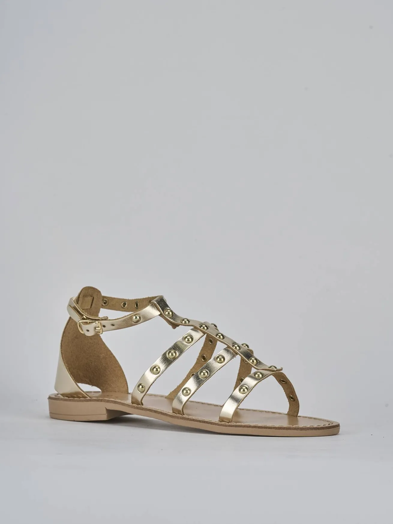 Questo sandalo in oro laminato presenta un tacco basso di 1 cm, ideale per chi desidera comodità senza rinunciare allo stile.