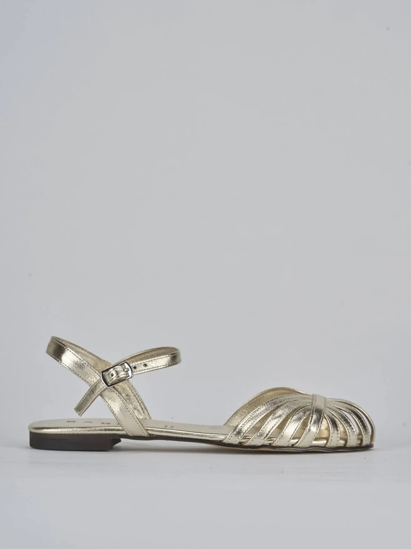 La tomaia è in morbida pelle laminata, arricchita da delicate fasce a ragnetto in punta che donano un tocco sofisticato.