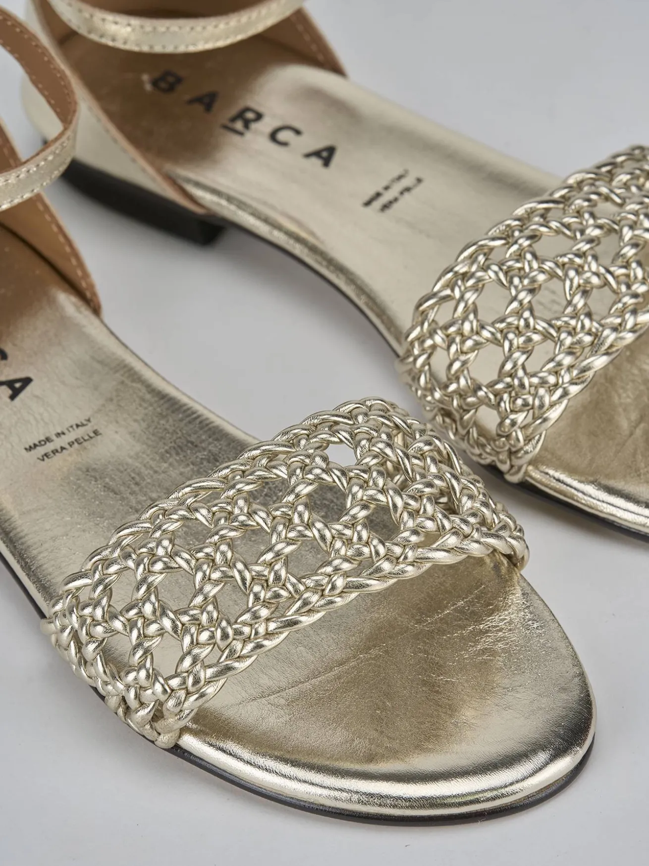 Realizzato in morbida pelle laminata color oro, questo sandalo presenta un tacco basso di 1 cm, ideale per chi cerca comodità senza rinunciare allo stile.