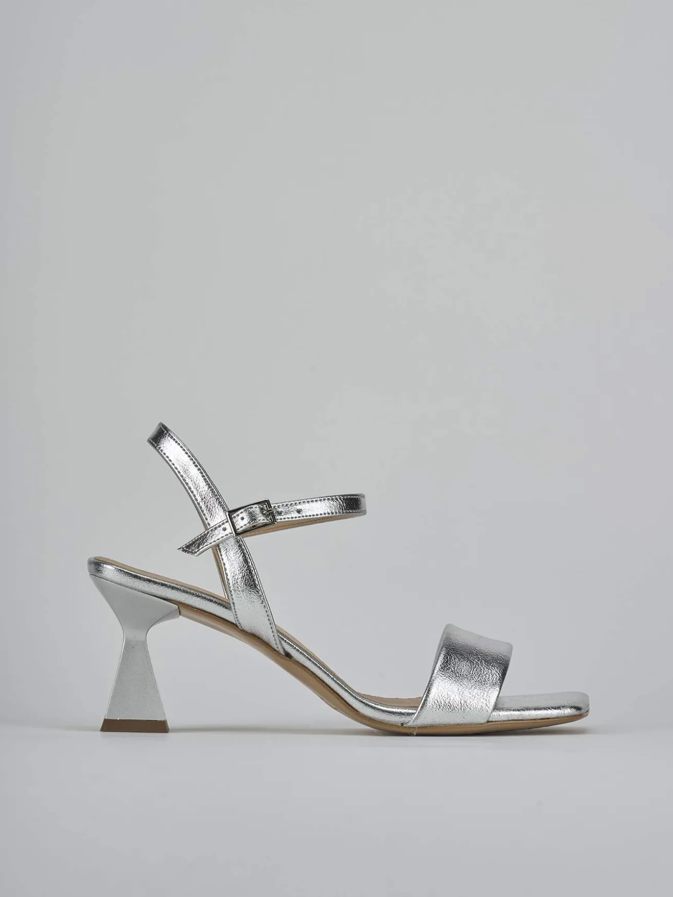 Sandalo tacco 7 cm, fondo in leggerissima gomma e soletto interno in vera pelle. Tomaia in morbida pelle laminata, punta squadrata, fascia unica in punta, cinturino con fibbia regolabile in caviglia e nuovissimo tacco rocchetto per un look chic.