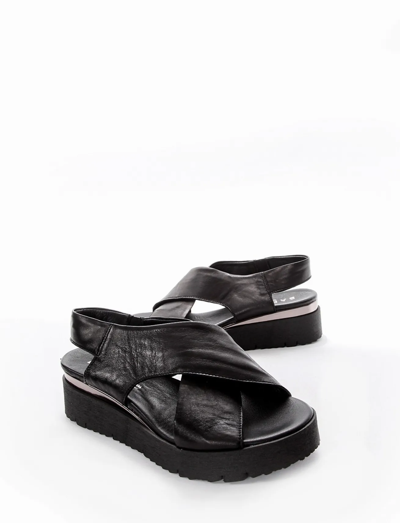sandalo zeppa 3 cm, fondo in gomma e soletto interno in vera pelle. Tomaia in morbidissima pelle incrociata, aperto in punta e cinturino posteriore fisso regolabile con fascetta elastica.