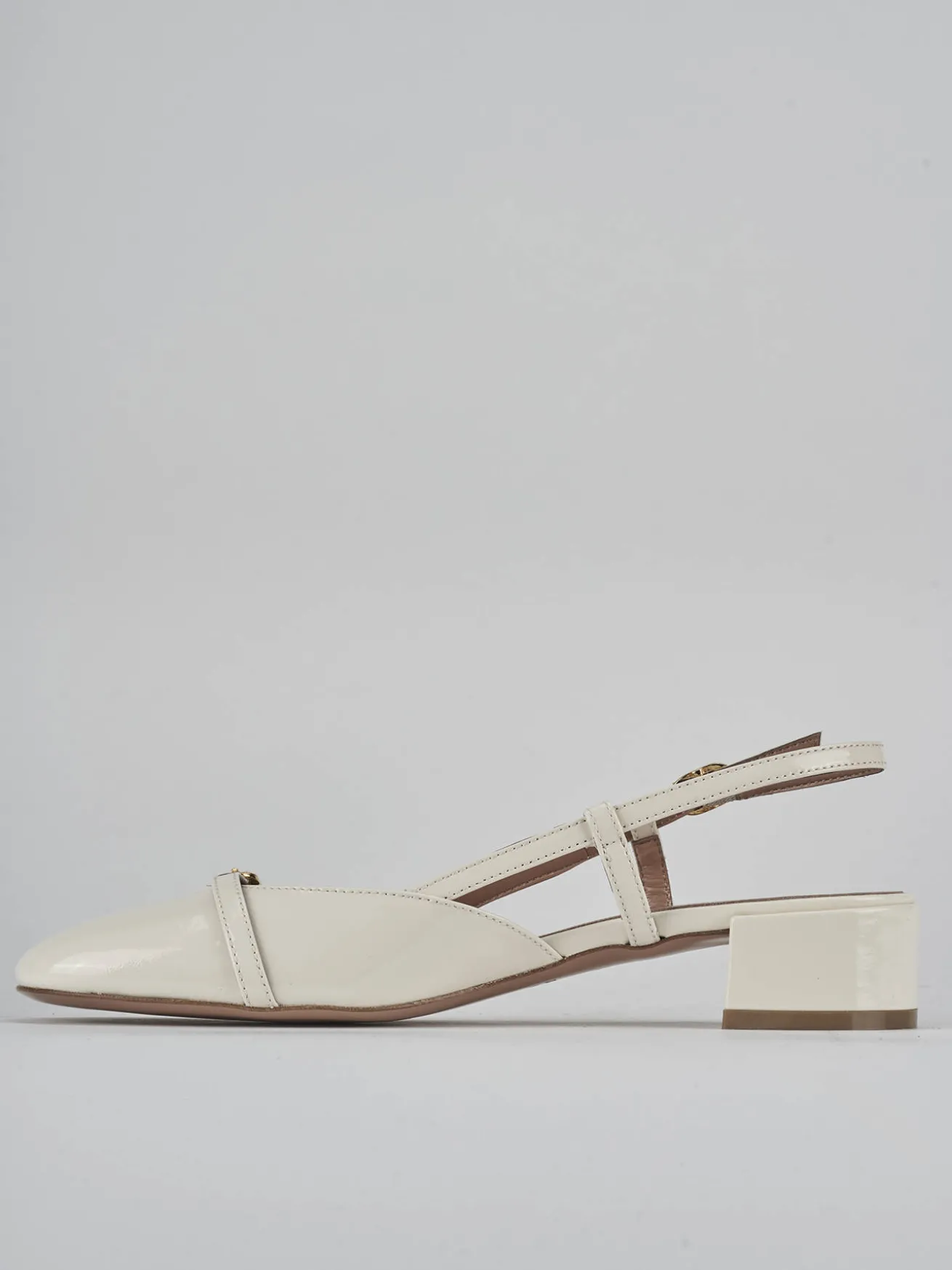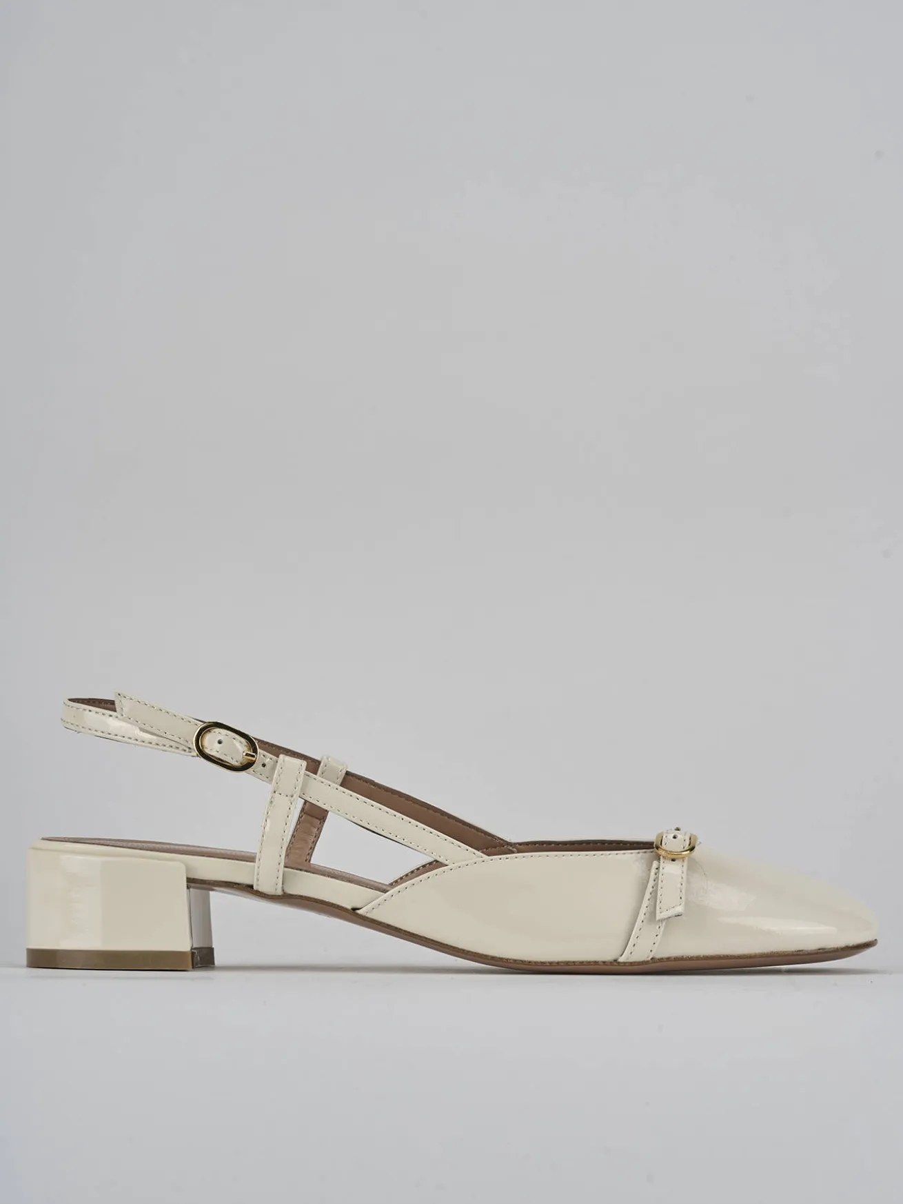 Slingback decolte’ tacco 3 cm fondo in cuoio e soletto interno in vera pelle. Tomaia in morbida pelle effetto verniciato, punta tonda, scollo profondo a ‘U’ con fibbia regolabile in punta e in caviglia, tacco comodo. Perfetto con un tailleur o una gonna midi.