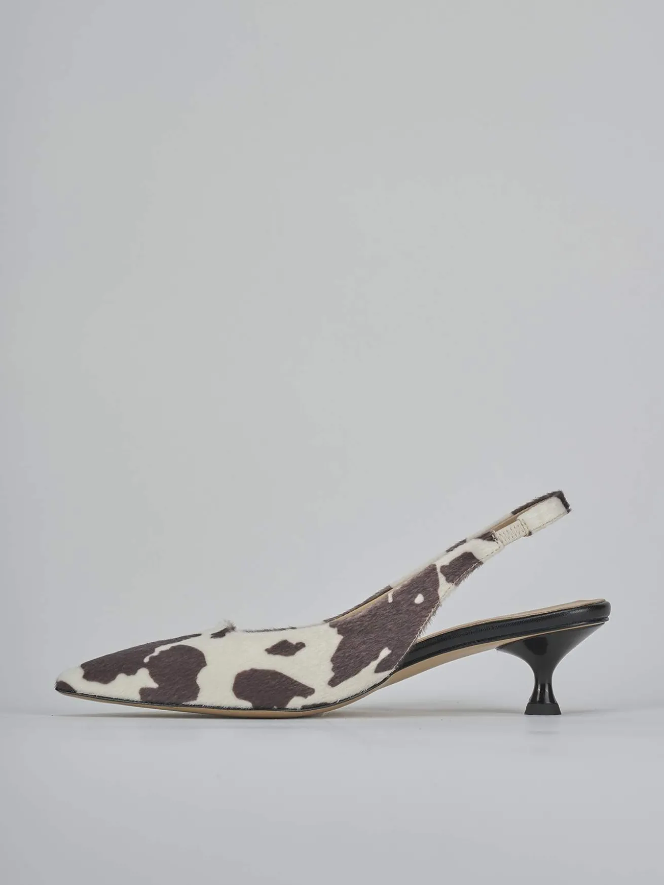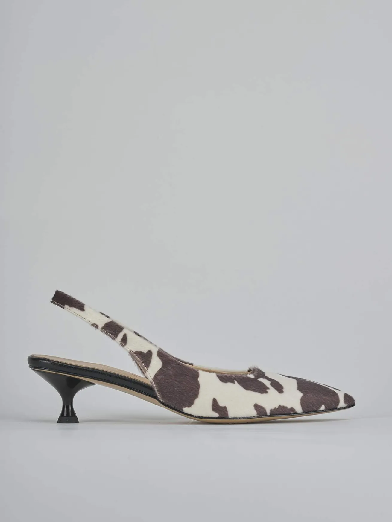 Slingback decolte’ tacco 4 cm fondo in leggerissima gomma e soletto interno in vera pelle. Tomaia in morbida pelle ricoperta in cavallino, punta sfilata, scollo squadrato, cinturino elasticizzato per il massimo del comfort e tacco rocchetto. Dal design ricercato che dura nel tempo.
