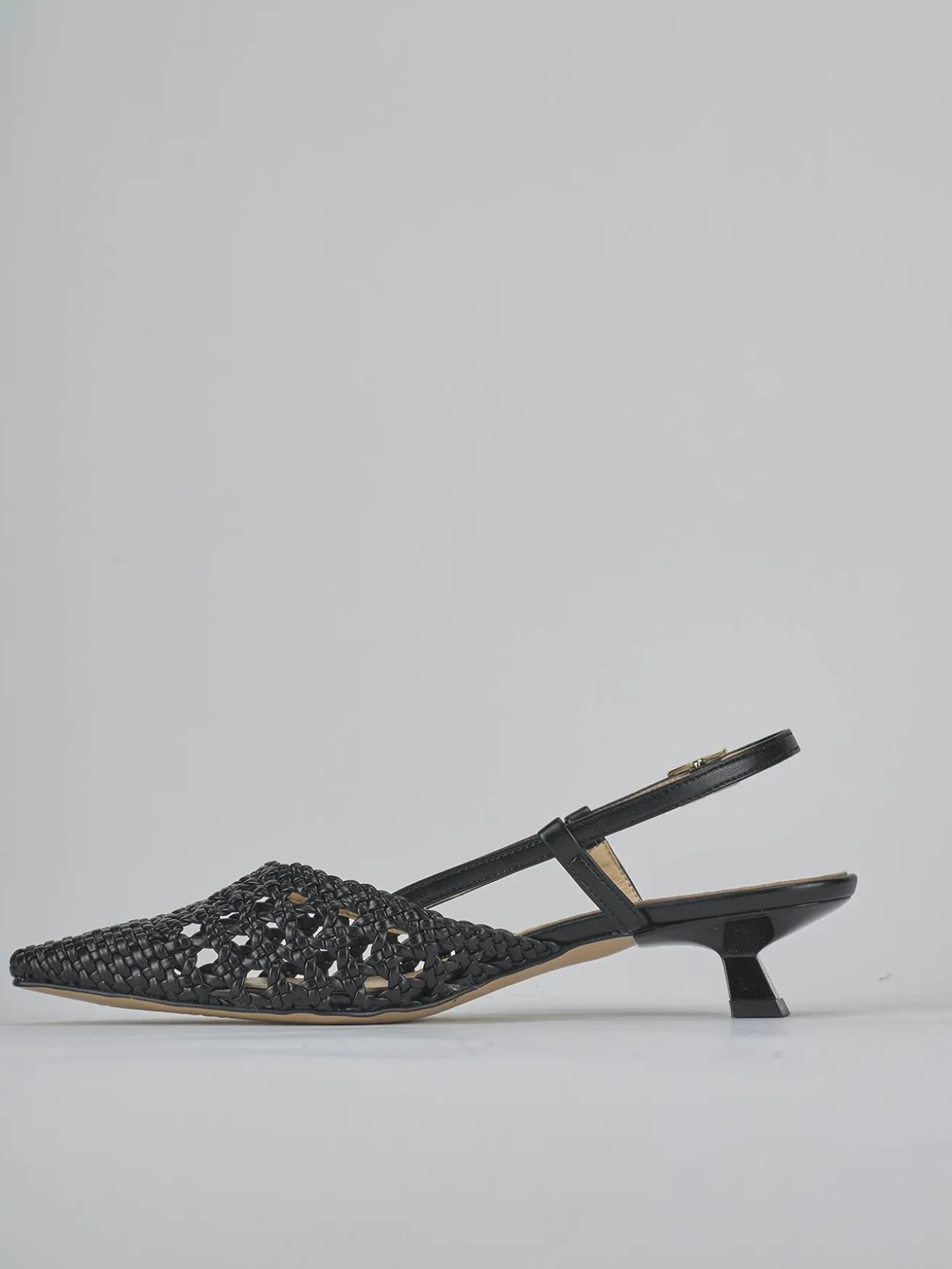 Slingback decolte’ tacco 4 cm fondo in leggerissima gomma e soletto interno in vera pelle. Tomaia in morbida pelle intrecciata, punta sfilata, puntale, cinturino con fibbia regolabile per un fit perfetto. Nuovissimo tacco rocchetto per un look chic.