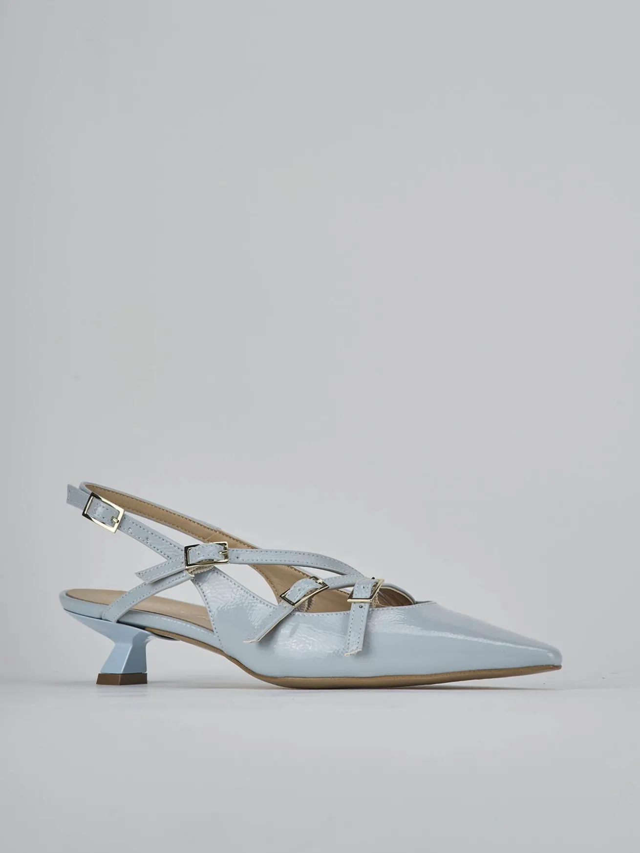 Slingback decolte’ tacco 4 cm fondo in leggerissima gomma e soletto interno in vera pelle. Tomaia in morbida pelle effetto verniciato, punta sfilata, scollo morbido a ‘U’, tre cinturini con fibbia regolabile e cinturino sottile sul tallone. Nuovissimo tacco rocchetto per un look cool.