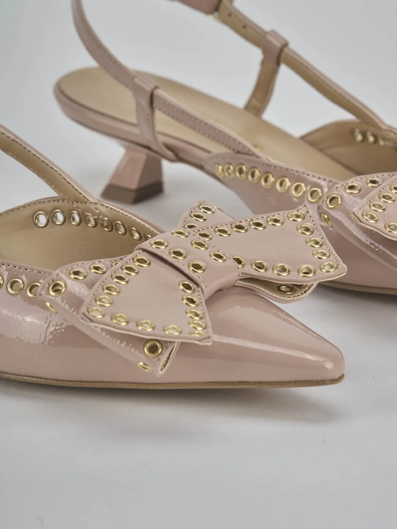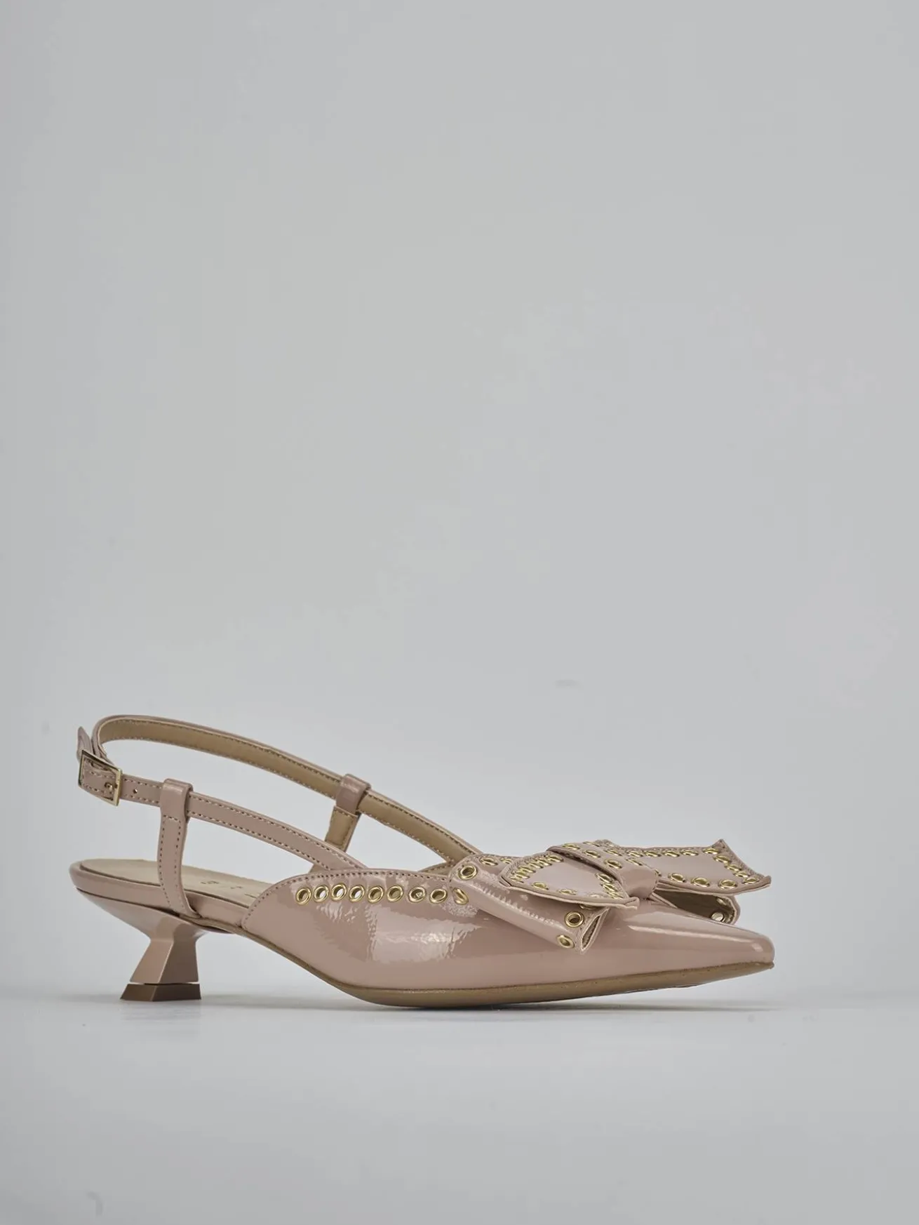 Slingback decolte’ tacco 4 cm fondo in leggerissima gomma e soletto interno in vera pelle. Tomaia in morbida pelle effetto verniciato, punta sfilata, fiocco, borchie forate, cinturino con fibbia regolabile e tacco rocchetto. Perfetto con un vestito lungo.