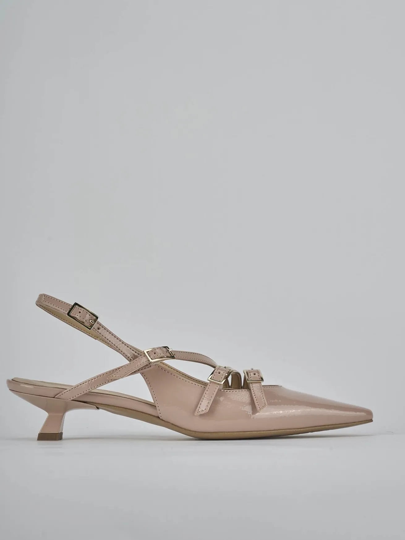 Slingback decolte’ tacco 4 cm fondo in leggerissima gomma e soletto interno in vera pelle. Tomaia in morbida pelle effetto verniciato, punta sfilata, scollo morbido a ‘U’, tre cinturini con fibbia regolabile e cinturino sottile sul tallone. Nuovissimo tacco rocchetto per un look cool.