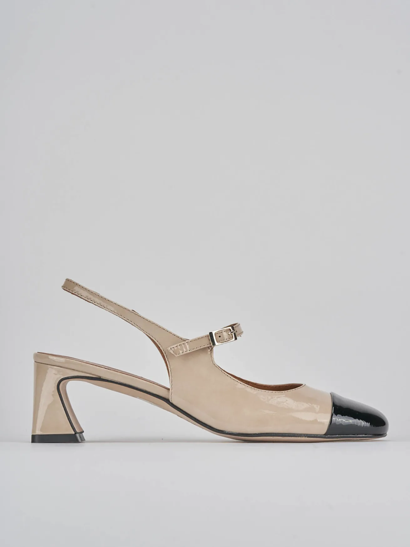Slingback decolte’ tacco 5 cm fondo in cuoio e soletto interno in vera pelle. tomaia in morbida pelle verniciata, punta leggermente squadrata, puntale, cinturino con fibbia regolabile e tacco cool. Perfetto per qualsiasi occasione e stagione!